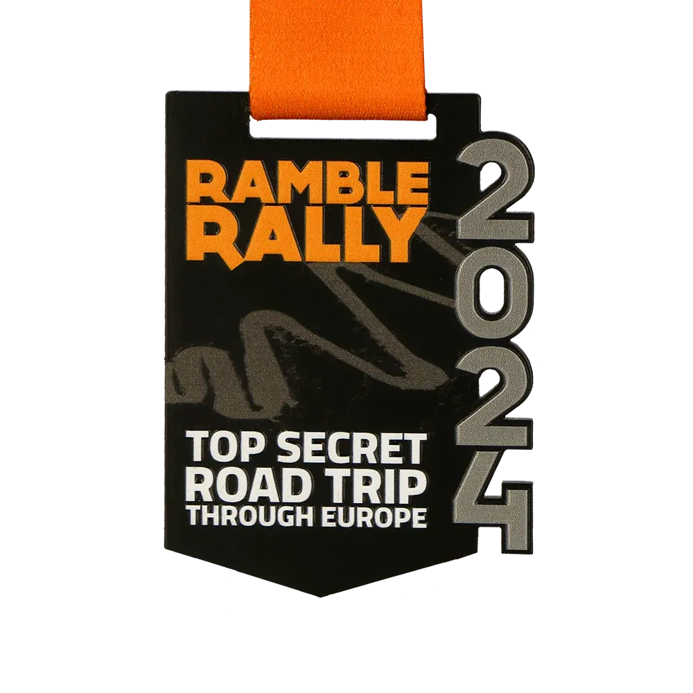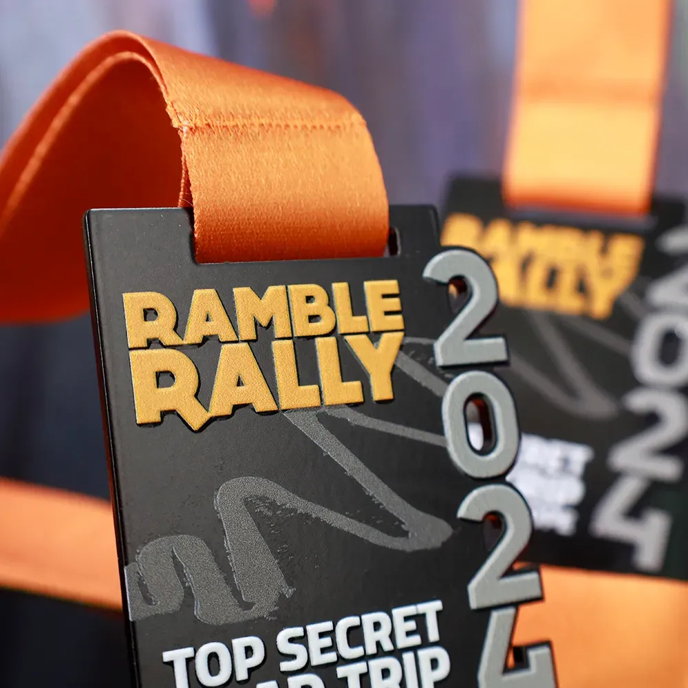 Una medalla personalizada creada para el Ramble Rally 2024. La medalla presenta tonos negros con acentos naranjas y grises. Tiene forma rectangular con el año recortado en un lateral. El nombre del evento se muestra en color naranja y el fondo está decorado con un mapa estilizado de la ruta.