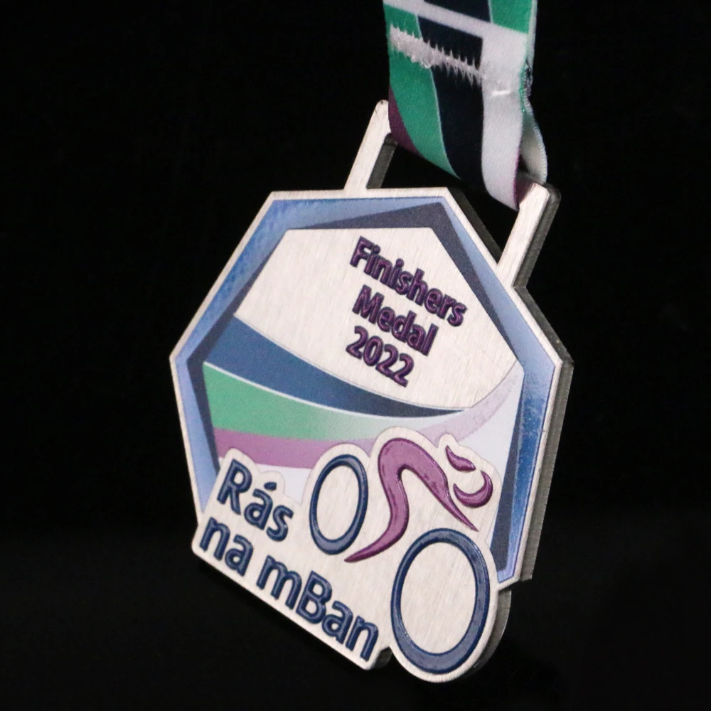 La tecnología de vanguardia nos permite crear diseños originales que se salen de lo común. Muchos de nuestros clientes optan por formas inusuales para sus medallas. Como resultado, sus premios llaman la atención y evocan recuerdos entrañables. Nuestra medalla de acero creada para Rás na mBan es un ejemplo perfecto de este tipo de diseño. Presenta una forma geométrica complementada con un elemento redondeado en la parte inferior. Además, aplicamos una impresión a color perfecta sobre su superficie en acabado plata antigua. Para que luzca aún más, aplicamos una capa de barniz transparente que le aporta un efecto brillante. Las decoraciones con forma de ciclista y el texto son tridimensionales para sentirse al tacto. El conjunto se completa con una cinta personalizada a juego con el diseño de la medalla.
