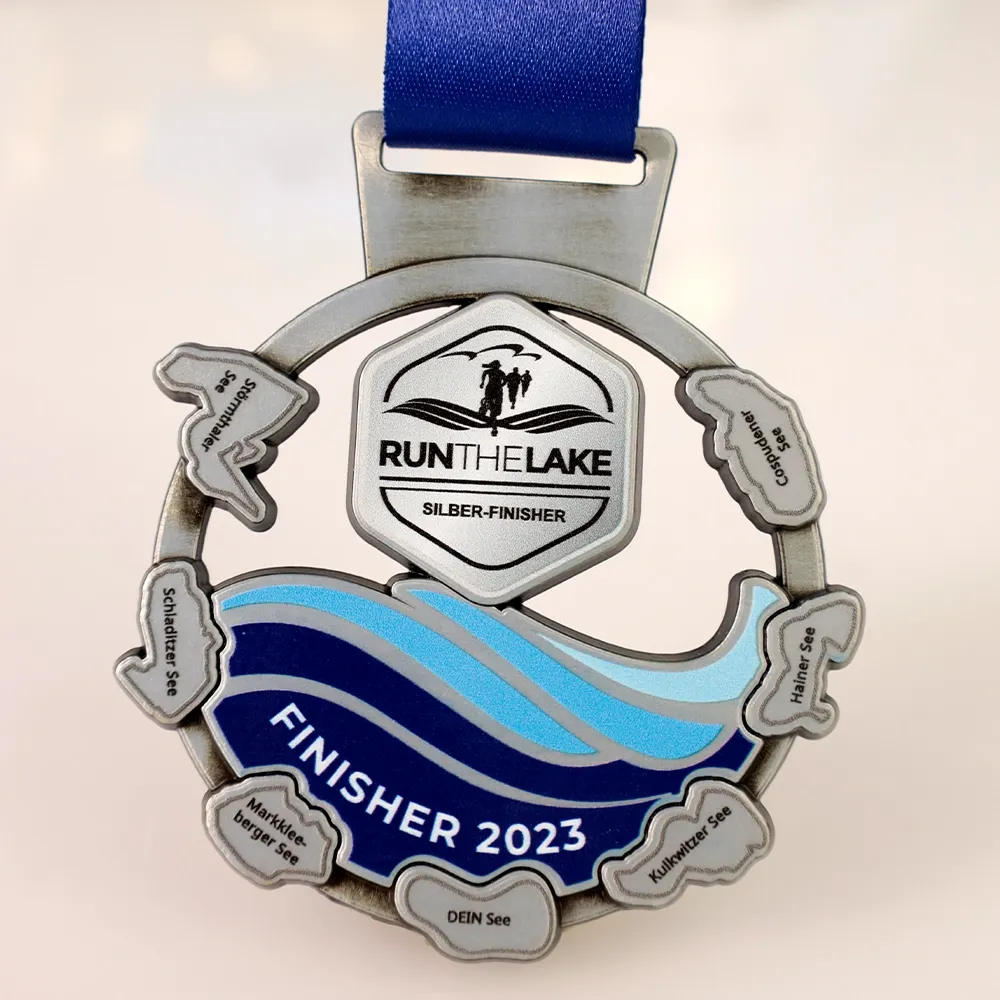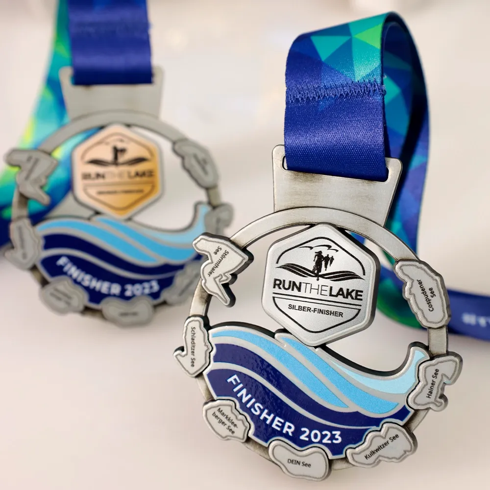 Una medalla personalizada deportiva para los participantes de Run the Lake 2023. Presenta olas del lago, rodeadas por los nombres de los lagos que los participantes recorrieron durante la carrera. El motivo central con el logotipo del evento y el texto resalta el logro de los participantes.