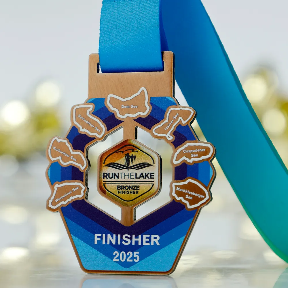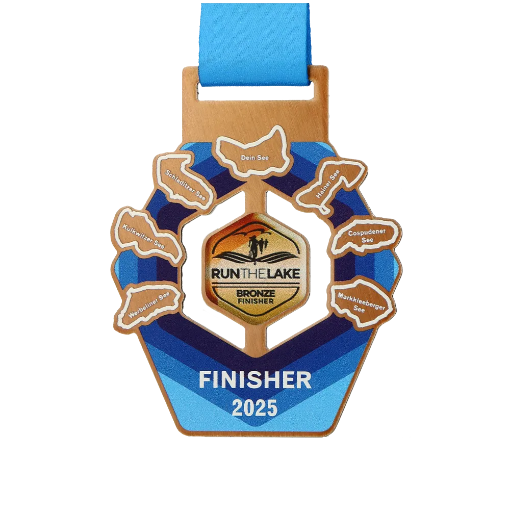 Medalla en forma de anillo con la indicación de los lagos y el logotipo central Run the Lake Bronze Finisher. Diseñada en tonos azules con detalles dorados y hecha con impresión UV. La personalización incluye los nombres de los lagos de las rutas de carrera, el año 2025 y la categoría finisher.