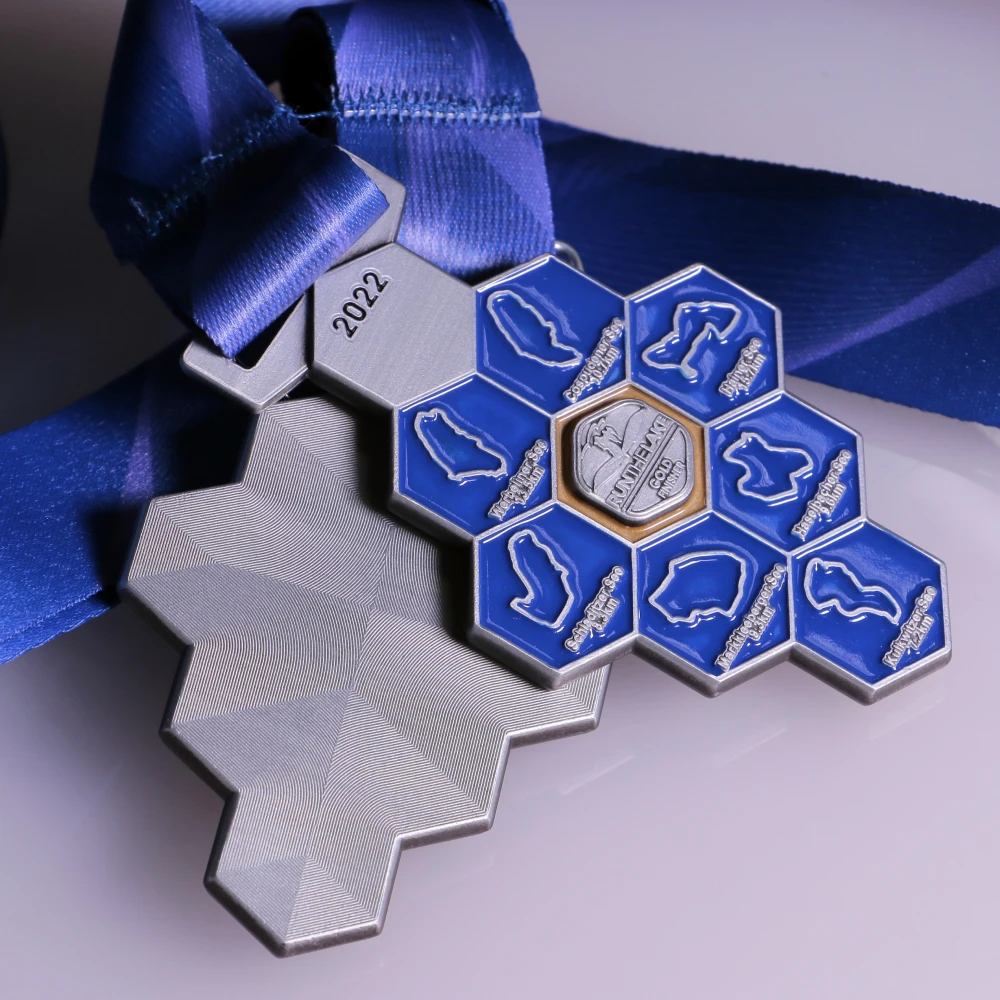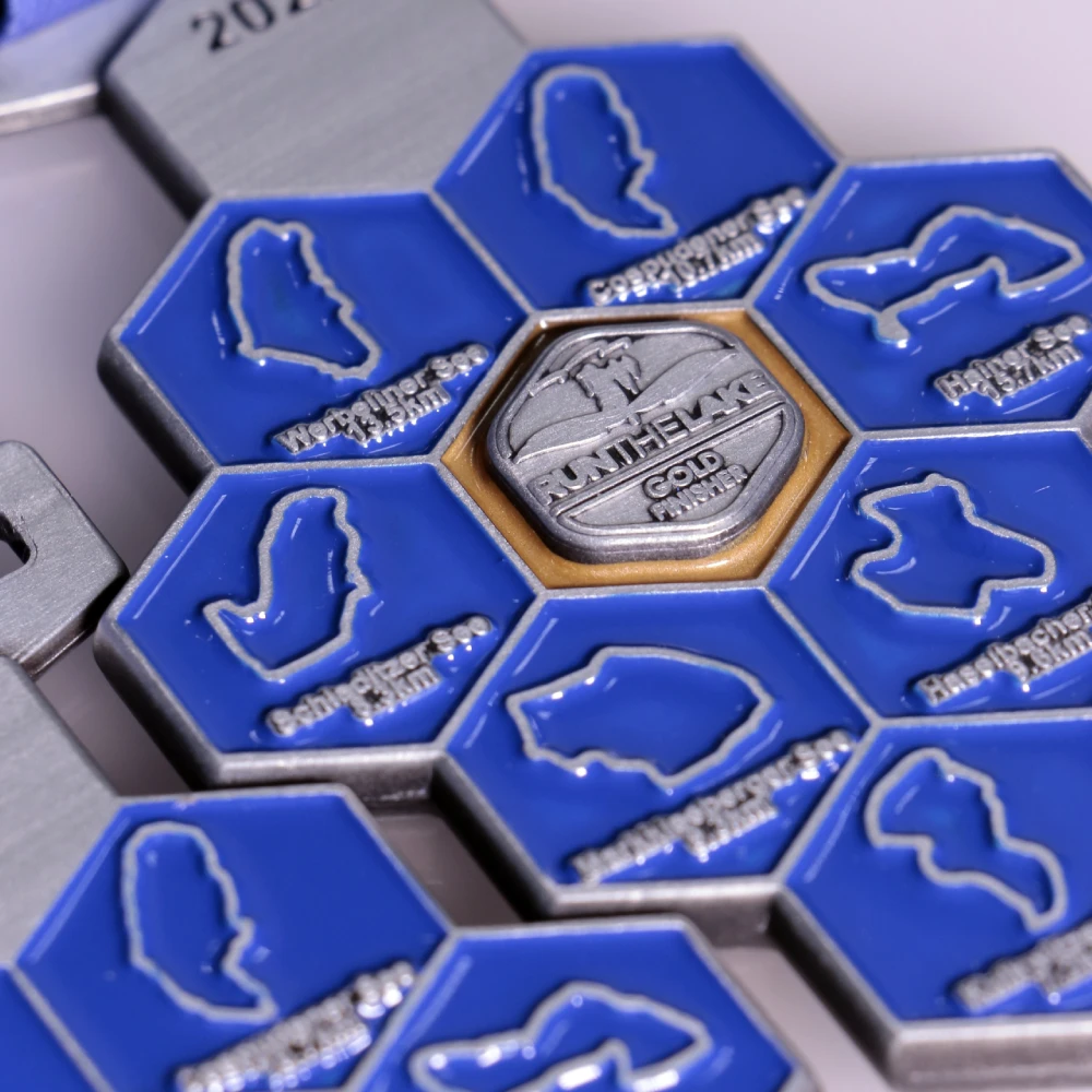 A petición de los organizadores, creamos medallas personalizadas para este evento. La forma distintiva de la medalla muestra mapas de lagos, cada uno asignado a una distancia específica. La parte central está resaltada con el logotipo del evento y se complementa con una cinta personalizada. Esta medalla para carrera es imprescindible para tu colección.