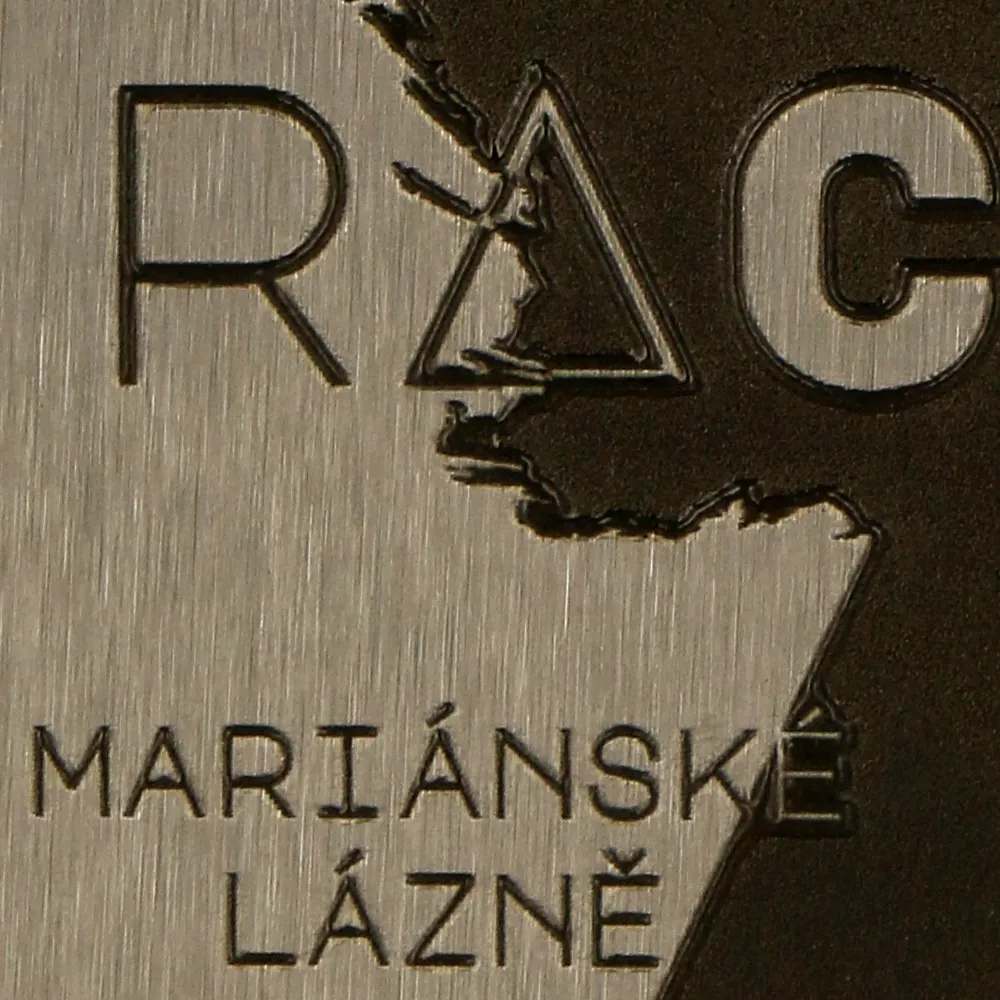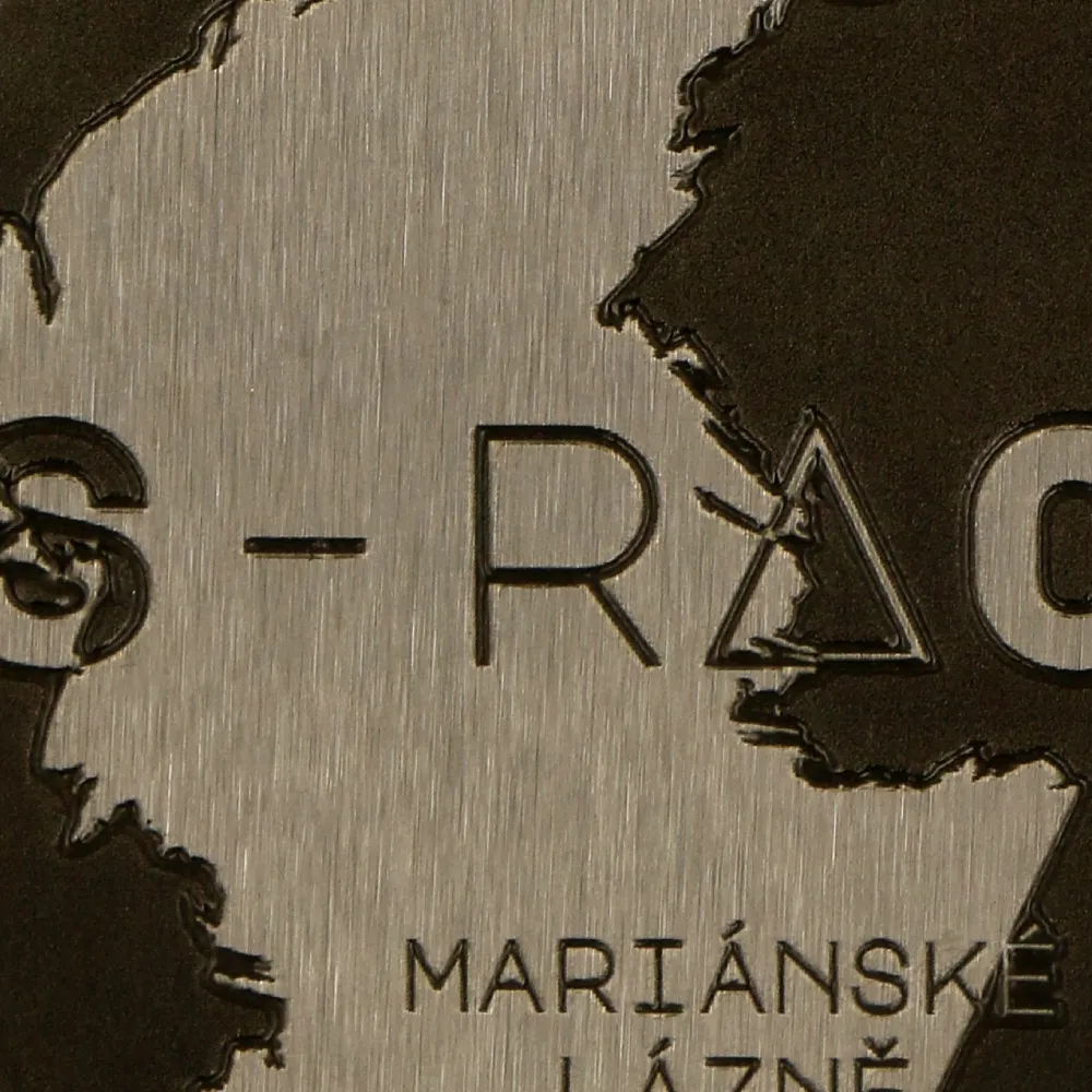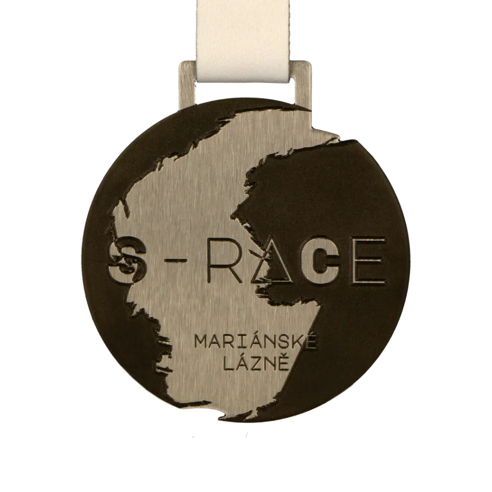 Una de nuestras medallas personalizadas diseñada para el evento S-Race en Mariánské Lázně. La medalla presenta el contorno de un mapa del mundo y un recorte con el nombre del evento, dándole un aspecto moderno y minimalista. Está colgada en una elegante cinta blanca, lo que resalta su carácter prestigioso.