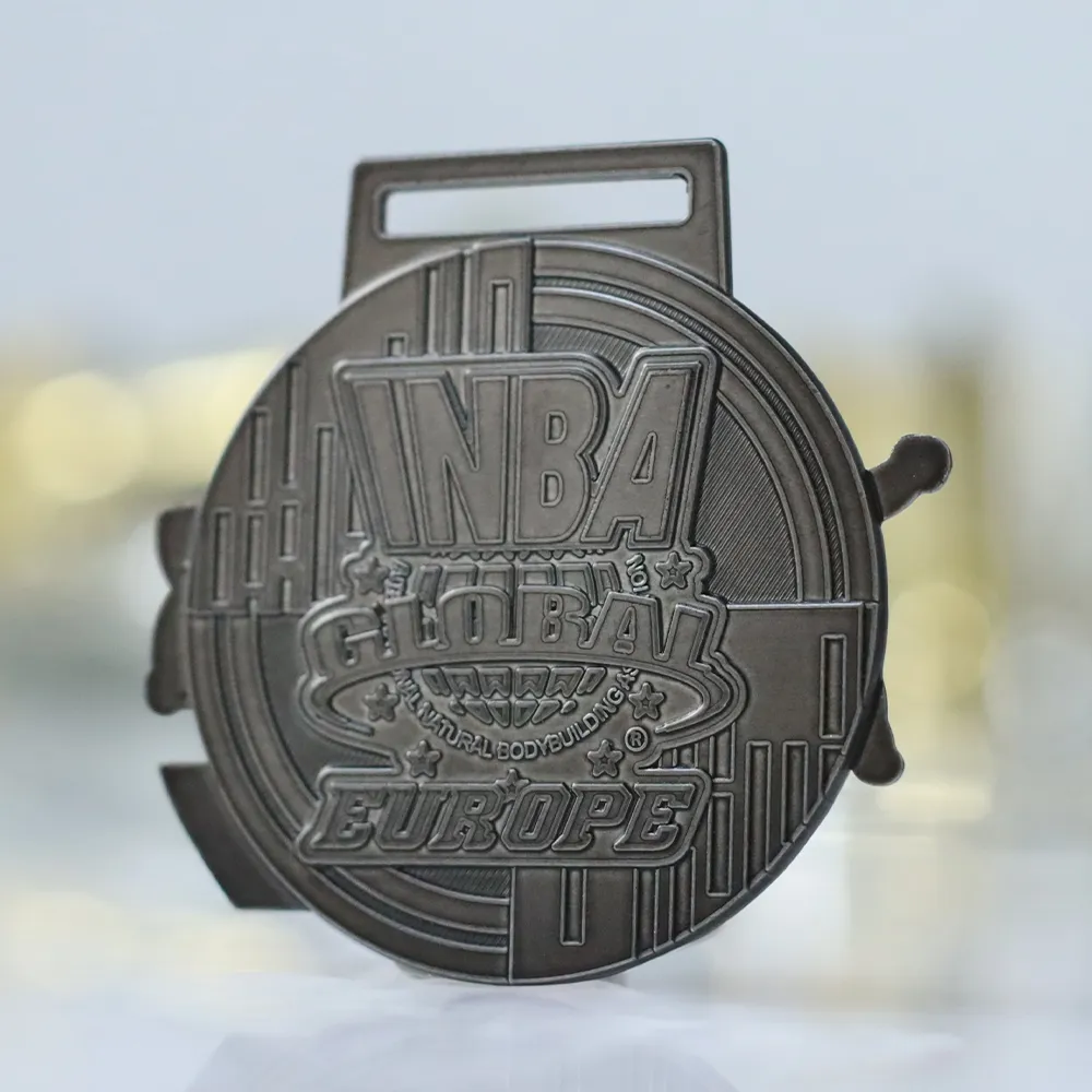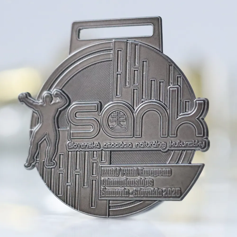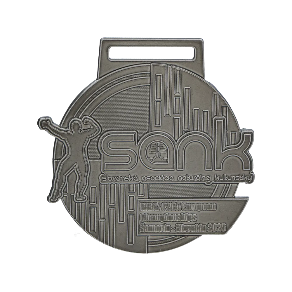 La medalla redonda de aleación de zinc elaborada para el evento Sank 2025 combina un diseño contemporáneo con la forma clásica de un trofeo deportivo. La técnica de fundición empleada proporciona una textura perceptible al tacto y un elegante acabado envejecido que armoniza perfectamente con el aro rectangular para la cinta. Este tipo de medallas fundidas es la elección ideal para organizadores que buscan productos de alta calidad adaptados al 100% al carácter prestigioso de la competición.