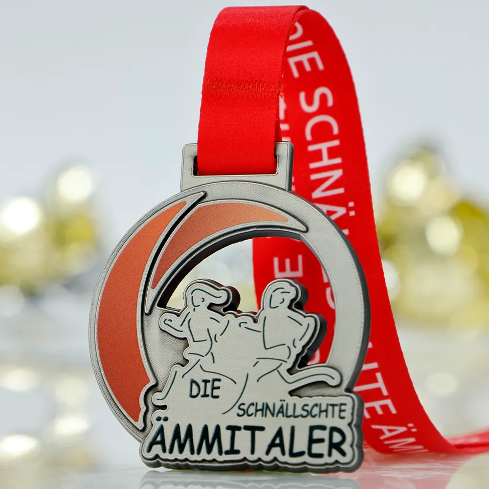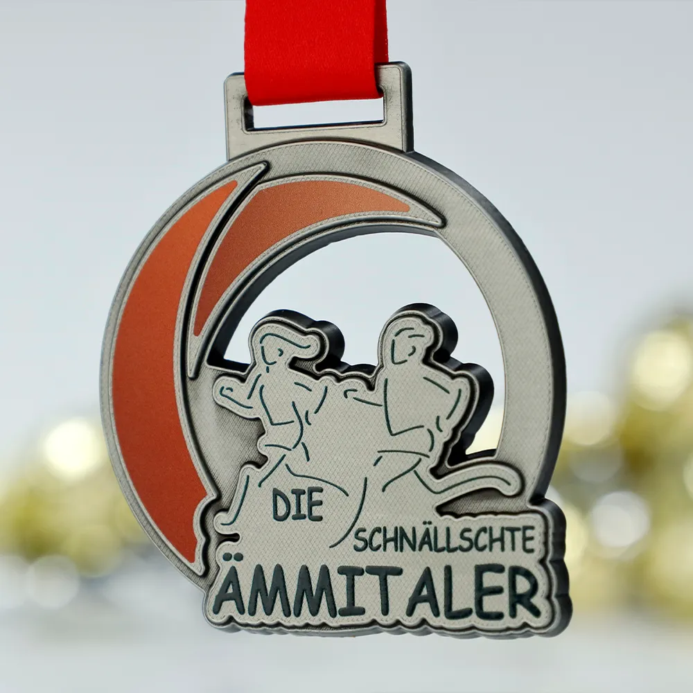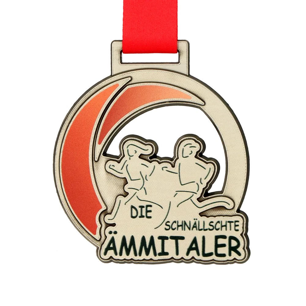 Esta medalla de running se realizó para el evento “Die Schnällschte Ämmitaler”. El disco está fundido en un tono plata claro, con relieves. Destaca un gran motivo semicircular en gamas de naranja y rojo, aplicado mediante impresión UV. En el anverso, bajo la escena de corredores, figura en negro el nombre de la prueba.
