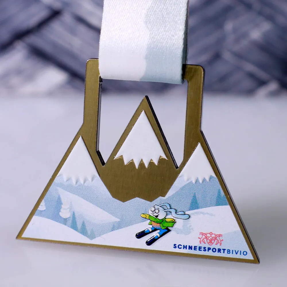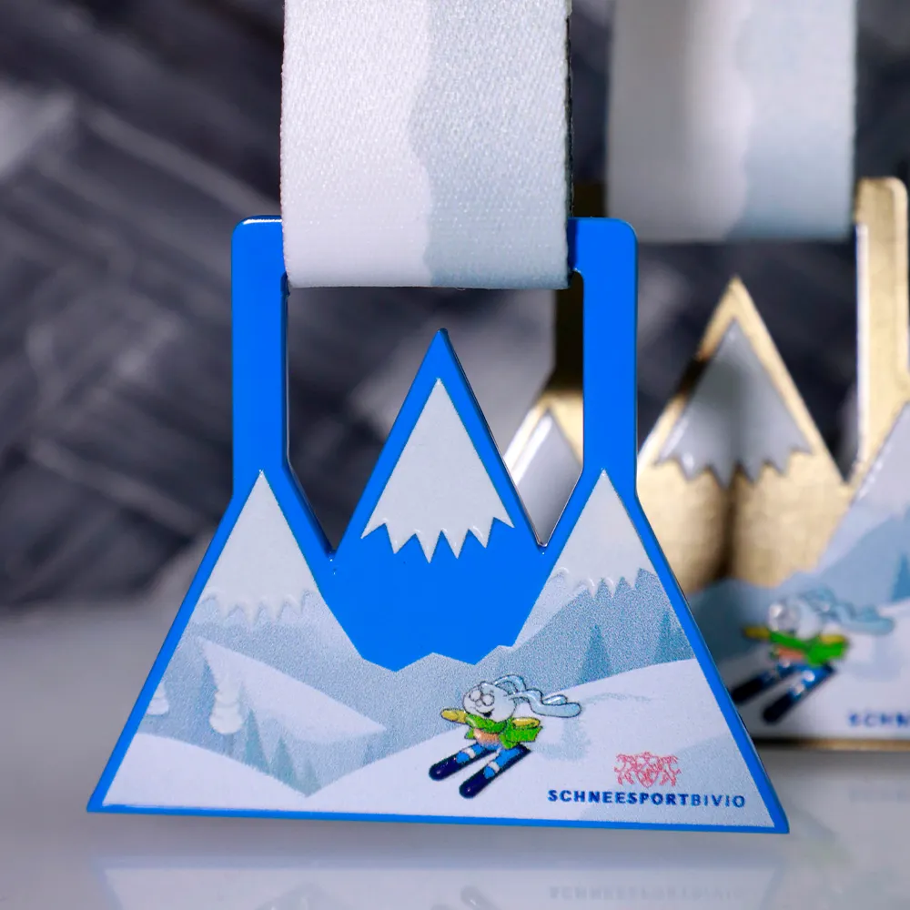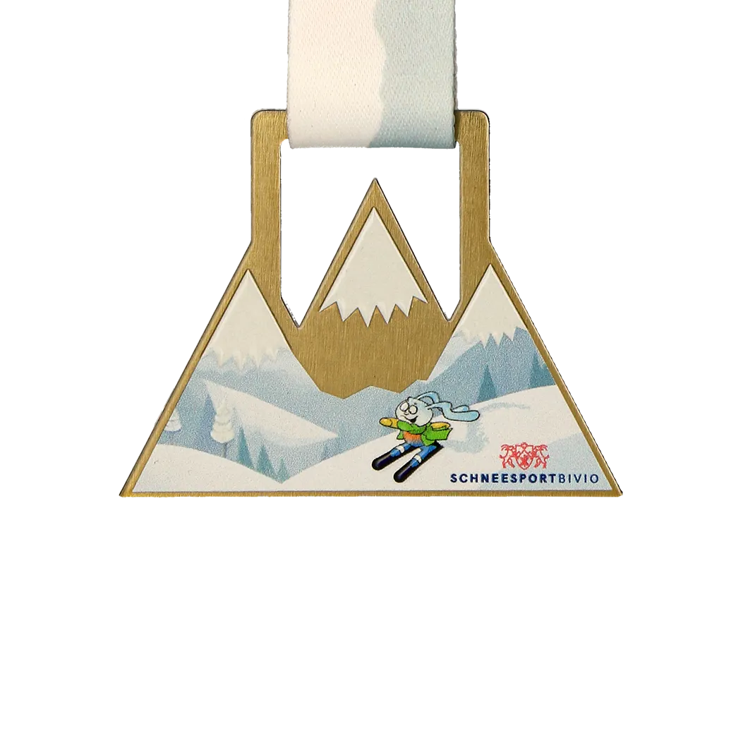 Una medalla personalizada de deportes de invierno para Schneesport Bivio. Una medalla dorada con forma de montaña y decoración en impresión UV relacionada temáticamente con el invierno.