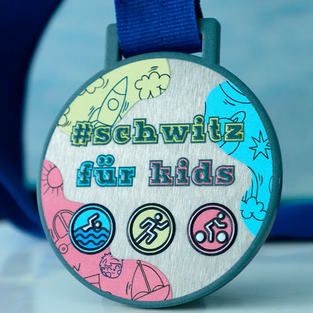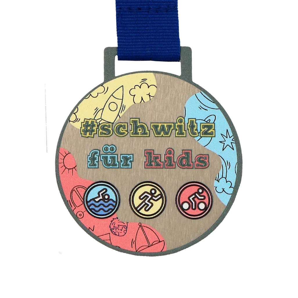 Una medalla personalizada infantil creada para el triatlón Schwitz für Kids. Una medalla plateada con impresión UV colorida relacionada con las disciplinas del triatlón.
