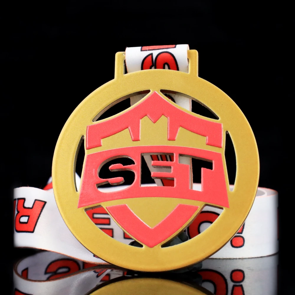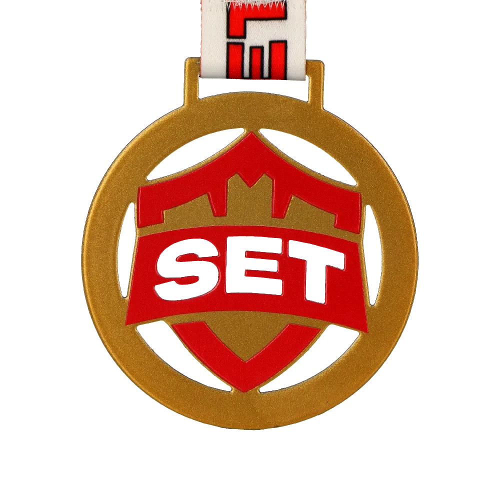 Nuestra oferta está llena de realizaciones modernas. Una de ellas son las medallas para carrera que preparamos para el SET X Run. Al crear este proyecto, junto con el cliente, optamos por medallas de acero en tres versiones de color clásicas: oro, plata y bronce. Todas tienen forma redonda con diversos recortes en su interior. El conjunto se complementa con una impresión a color que hace referencia al tema del evento y se remata con una cinta de sublimación adaptada al diseño moderno de la medalla.