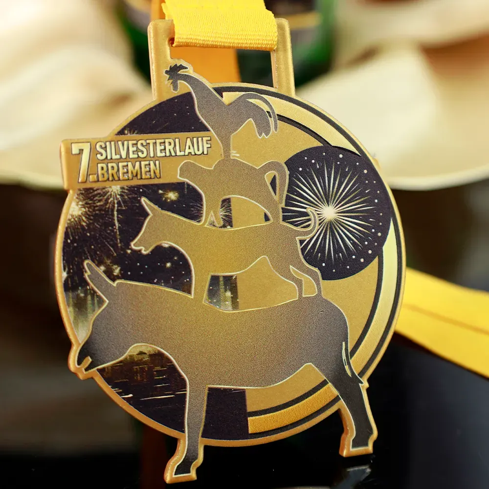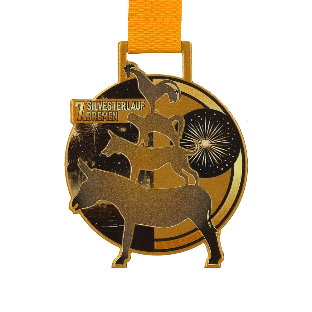 La medalla personalizada de carrera creada para la 7ª Silvesterlauf Bremen es perfecta como recompensa para los participantes de la carrera de Nochevieja. La realizamos en tonos dorados con elementos en blanco y negro. La medalla es redonda y presenta el motivo de los famosos músicos de Bremen: el gallo, el gato, el perro y el burro.