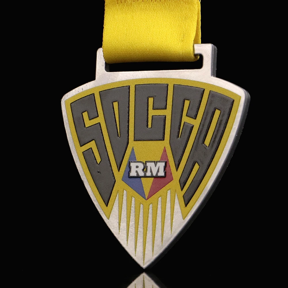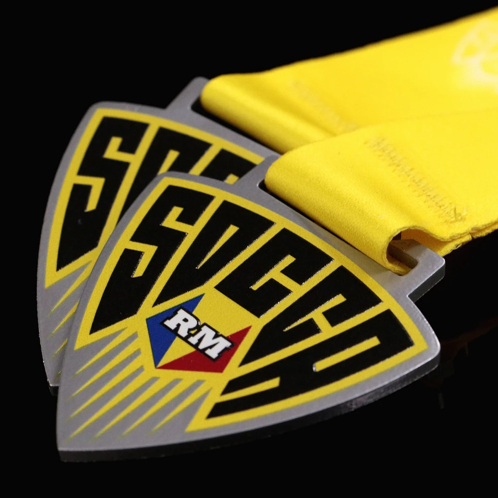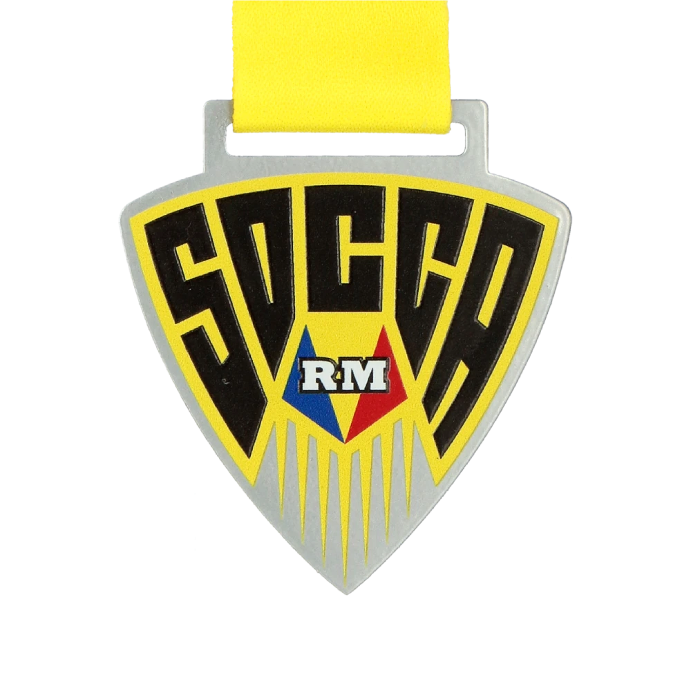 En Winmed, podemos fabricar cualquier medalla en cualquier forma. Un ejemplo perfecto es la medalla de acero para la competición Socca Moldova, inspirada en el logotipo del organizador. Su forma triangular, suavemente redondeada, la convierte en un recuerdo tangible del evento. Además, al diseñar la medalla, mantuvimos la característica combinación de colores del organizador. La llamativa impresión en amarillo y negro es realmente atractiva y complementa perfectamente el diseño. También merece mención la decoración de la superficie de la medalla, ligeramente convexa para sentirse al tacto. Además, está resaltada con un barniz brillante. El conjunto se completa con una cinta amarilla ancha que combina con los colores de la medalla.