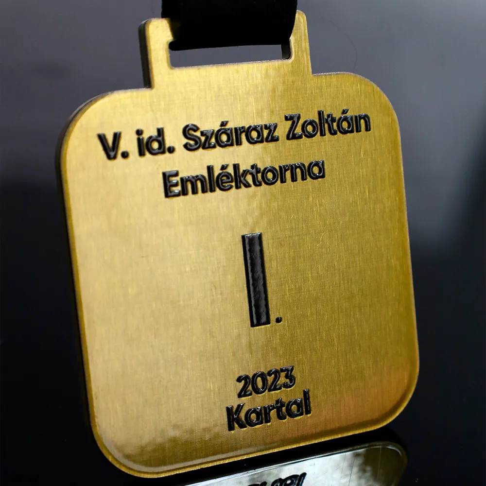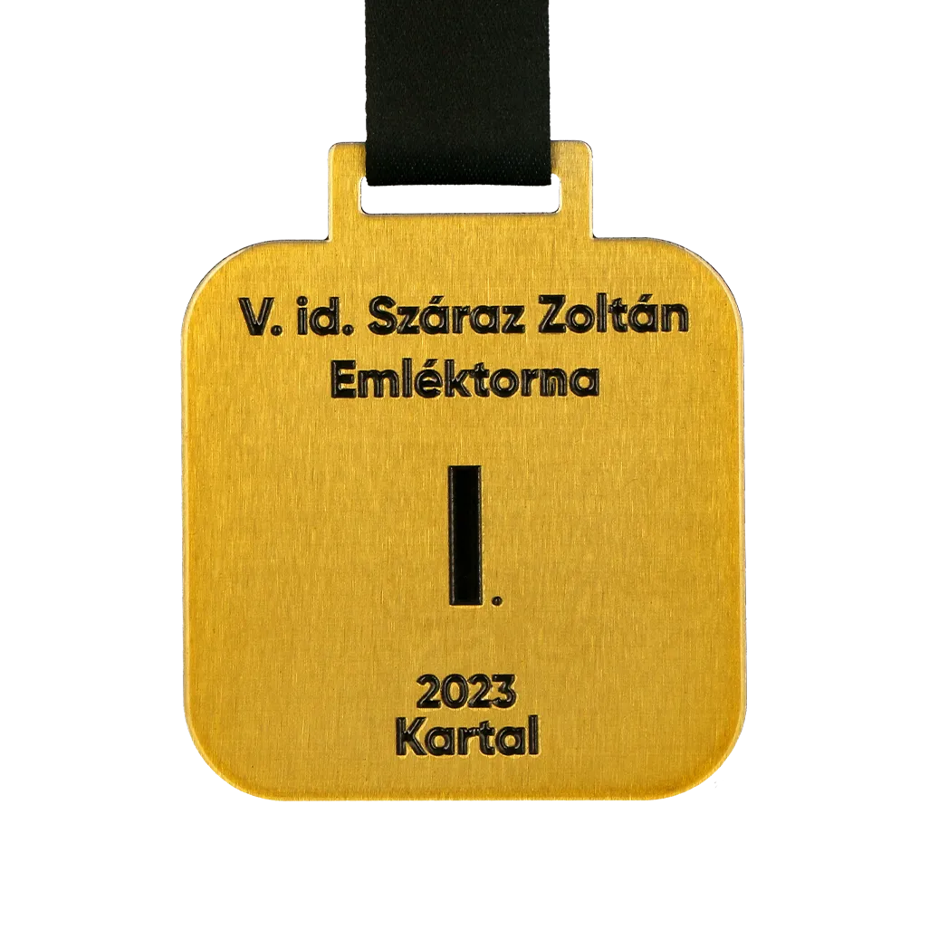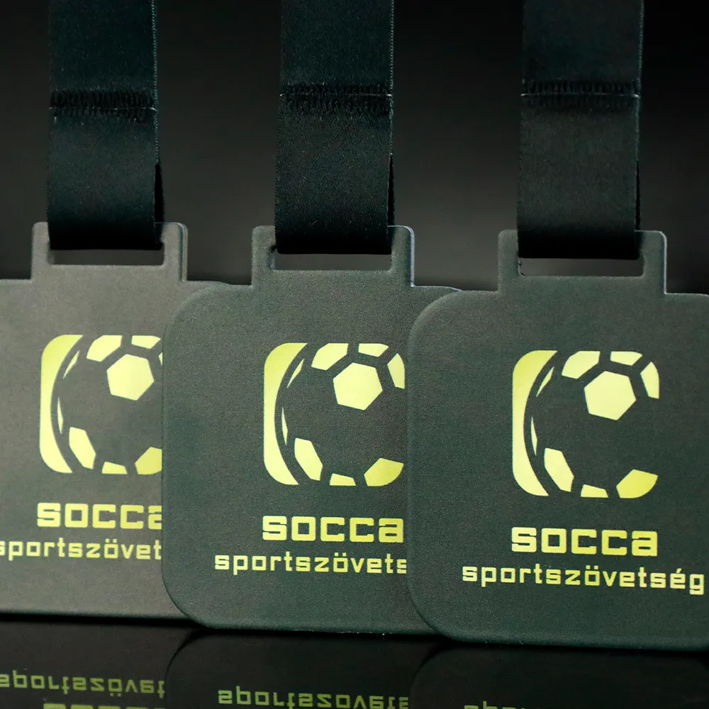 Una medalla personalizada de fútbol hecha para la SOCCA Sportszövetség. Es una medalla dorada de forma cuadrada con relieve e impresión negra.