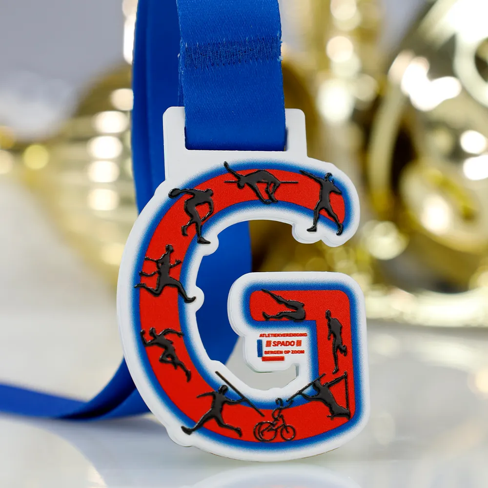 Una medalla personalizada creada para un evento deportivo, que representa varias disciplinas (carrera, ciclismo, salto de altura) sobre el fondo de la letra “G”. Los colores dominantes son rojo y azul, con siluetas negras contrastantes de atletas hechas con impresión UV. La medalla está personalizada con un logotipo y el nombre del evento. Incluye una cinta azul.