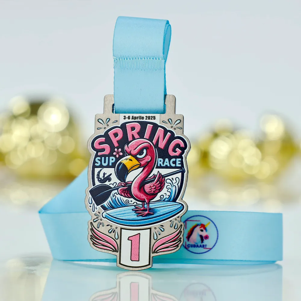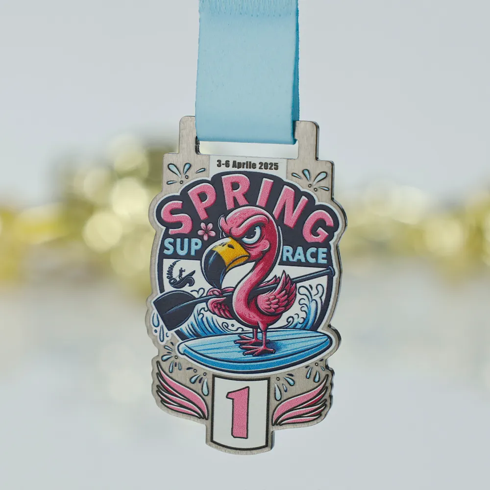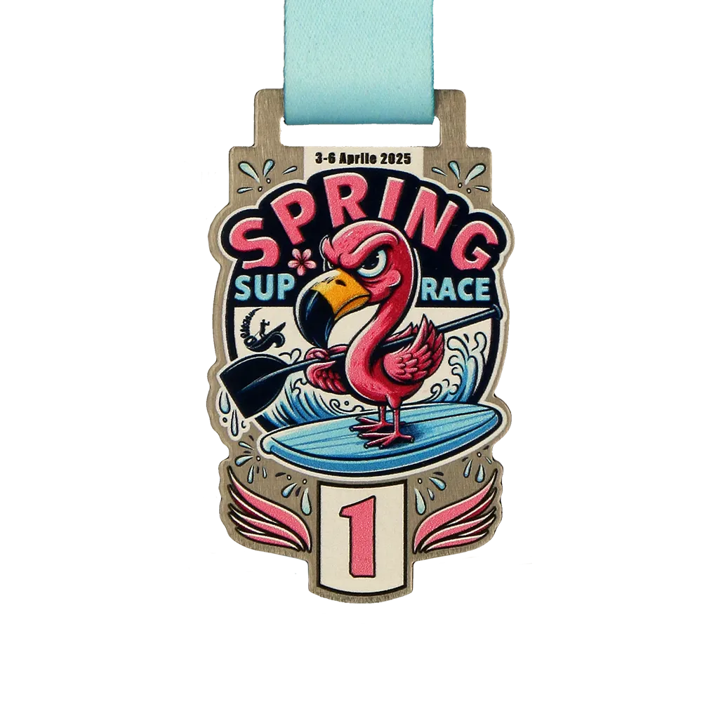 Una medalla personalizada creada para la competición de SUP “Spring SUP Race” que tendrá lugar en abril de 2025. Un gráfico colorido y dinámico muestra un flamenco sobre una tabla de SUP en tonos rosa, azul y negro, realizado con impresión UV. La personalización incluye la fecha del evento y la posición alcanzada. Incluye una cinta azul clara.