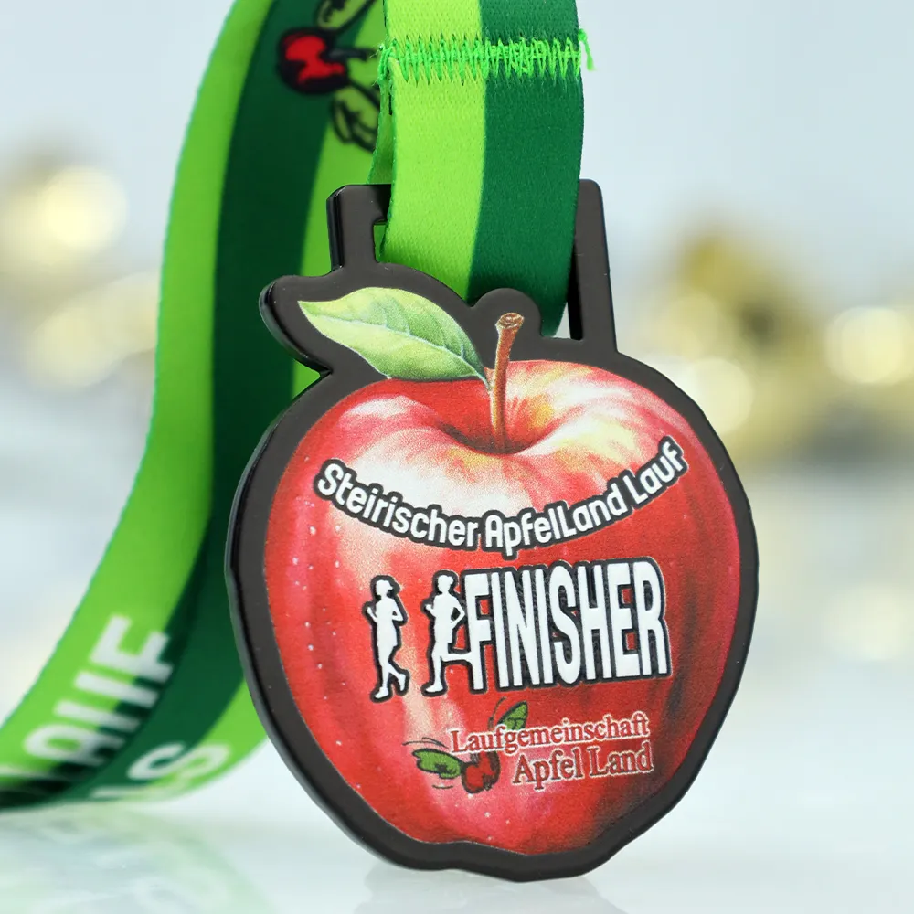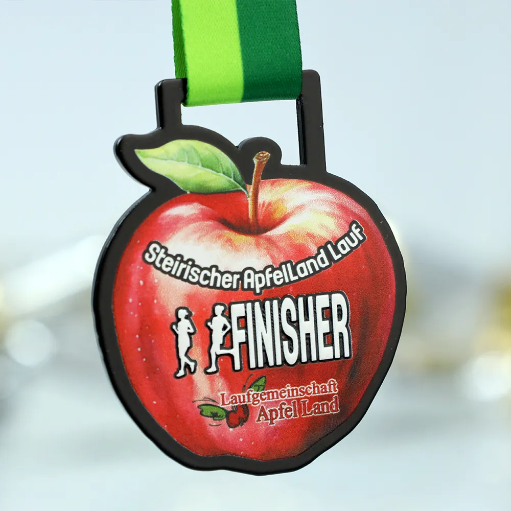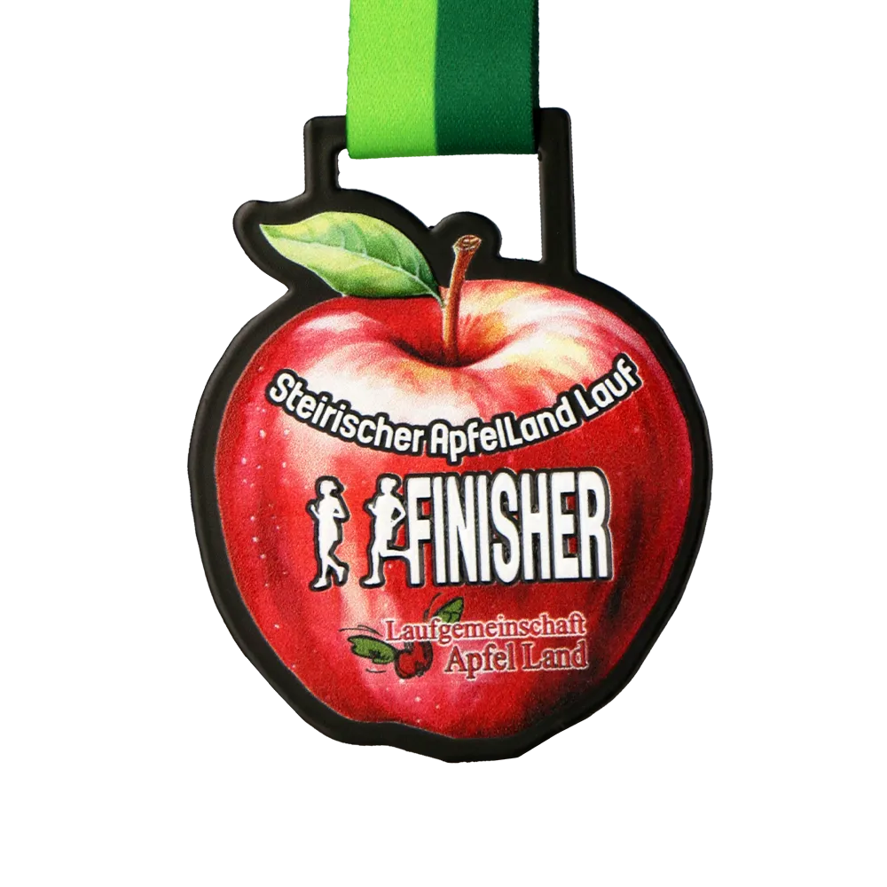 Esta sólida medalla personalizada, diseñada para el evento Steirischer ApfelLand Lauf, destaca por su forma a medida que reproduce perfectamente el contorno de una manzana con su hoja. La base es un metal resistente cubierto con gráficos aplicados mediante una moderna impresión UV. Esta medalla demuestra que la tecnología de producción avanzada puede convertir un diseño gráfico en una pequeña obra de arte funcional.