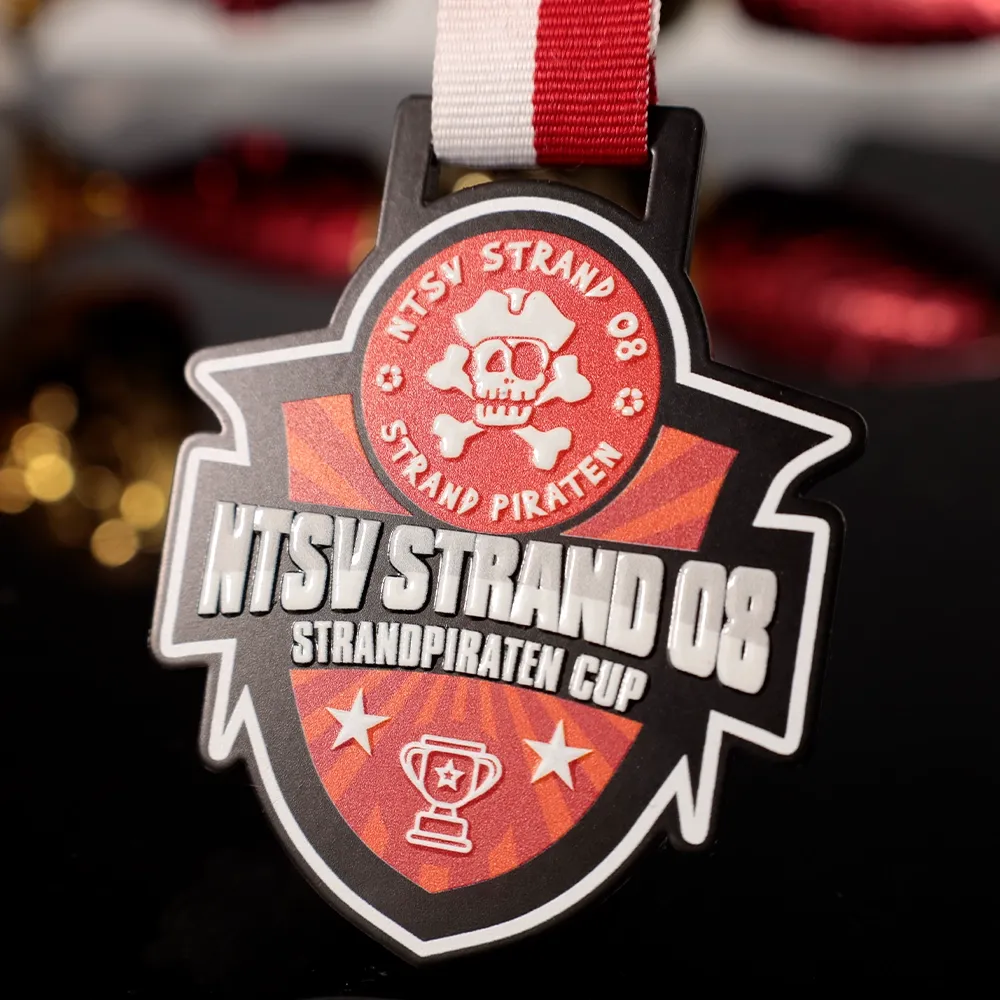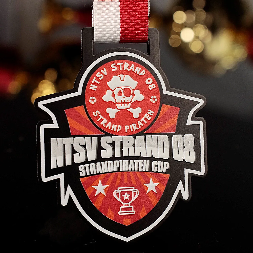 A football medal for participants of the Strandpiraten Cup organised by NTSV Strand 08. The medal has a dynamic design with a skull and crossbones motif, symbolising the pirate theme of the event. The vivid colours and detailed execution highlight the unique character of this medal for children.