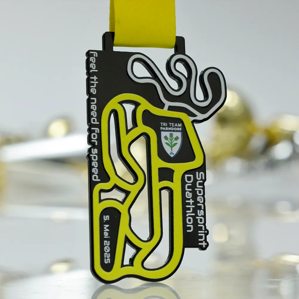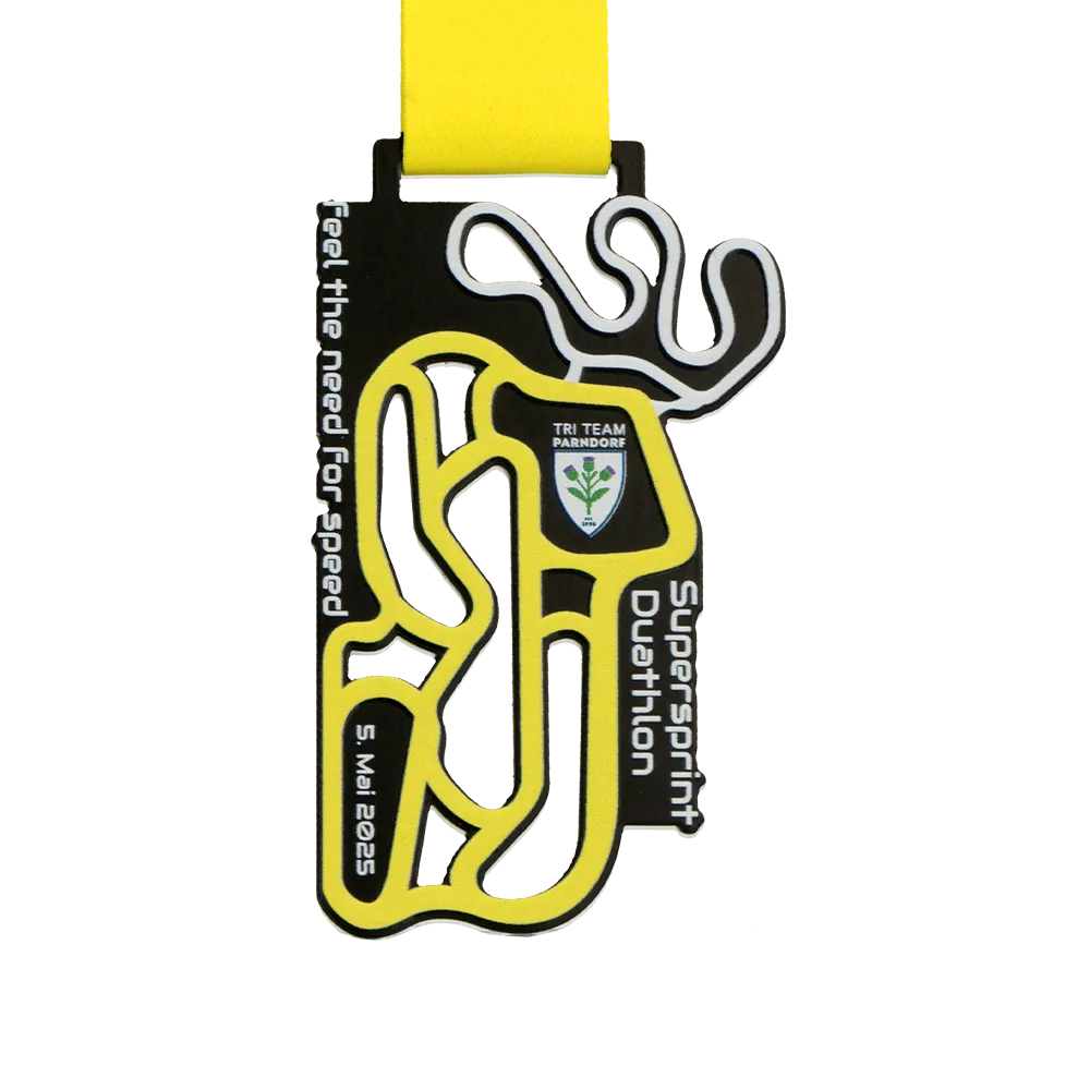 Medalla personalizada diseñada para la competición Supersprint Duathlon. Es una medalla de metal. El frente presenta un gráfico original con el recorrido de la carrera, el logotipo del Tri Team Parndorf y la fecha del evento. Todos los elementos coloridos se realizaron mediante impresión UV.
