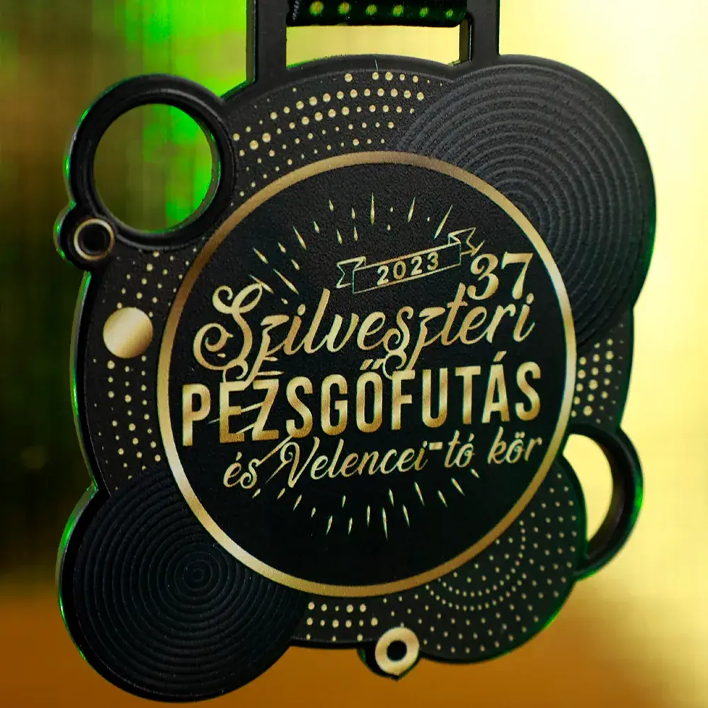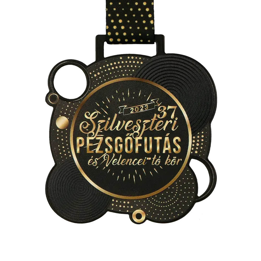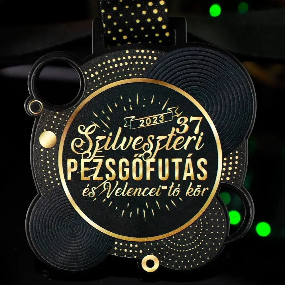 Una medalla personalizada para el Szilveszteri Pezsgőfutás, diseñada para los participantes de la carrera anual de Nochevieja alrededor del Velencei-tó. Presenta tonos negros y dorados, con forma redonda, recortes geométricos adicionales y detalles dorados.