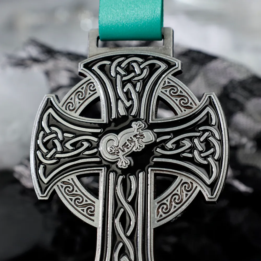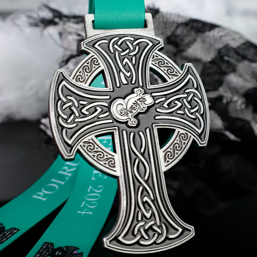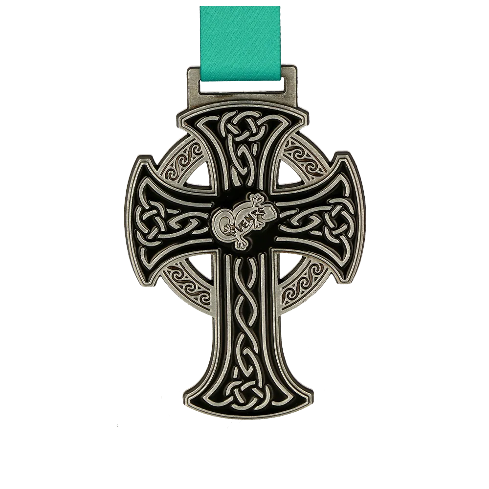 Una medalla personalizada para los participantes del Polruan Shuffle es un recuerdo único para todos los que participaron en este evento. Esta medalla fundida en 2D tiene forma de cruz celta con intrincados patrones y detalles.
