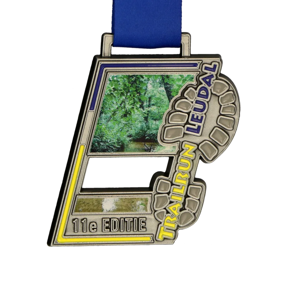 Unas medallas personalizadas para el Trailrun Leudal, 11ª edición. Presentan impresión UV con un tema forestal y la silueta clara de una huella. Los colores del esmalte – amarillo y azul – resaltan el nombre del evento. La medalla personalizada cuelga de una cinta azul.