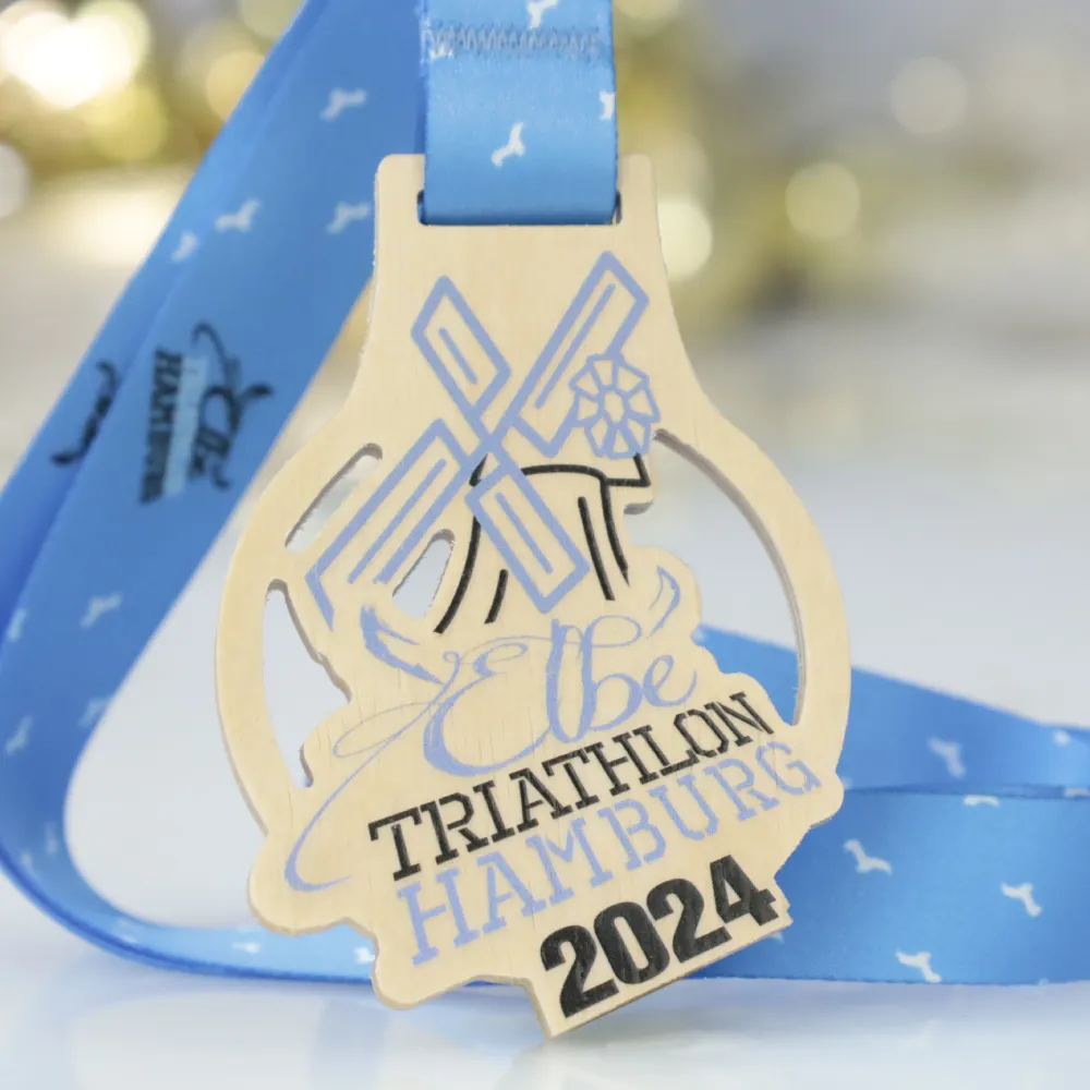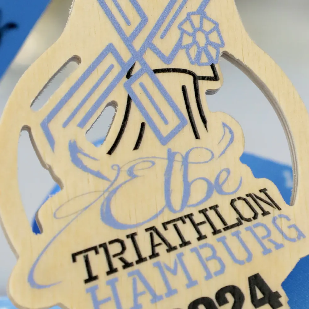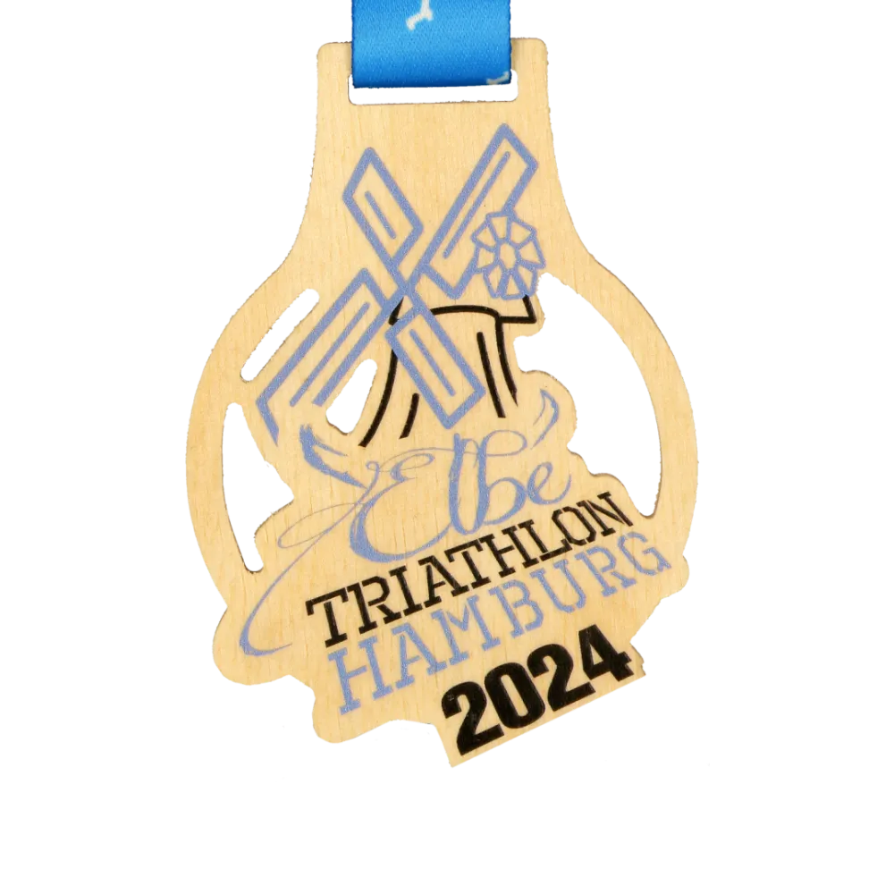 Medalla de madera de contrachapado, diseñada para el Elbe Triathlon Hamburg 2024. Destaca por su forma única y una impresión UV que representa un molino de agua, símbolo de la región. El color natural de la madera se complementa con acentos gráficos en azul y negro. La personalización incluye el nombre del evento, la ubicación y el año.