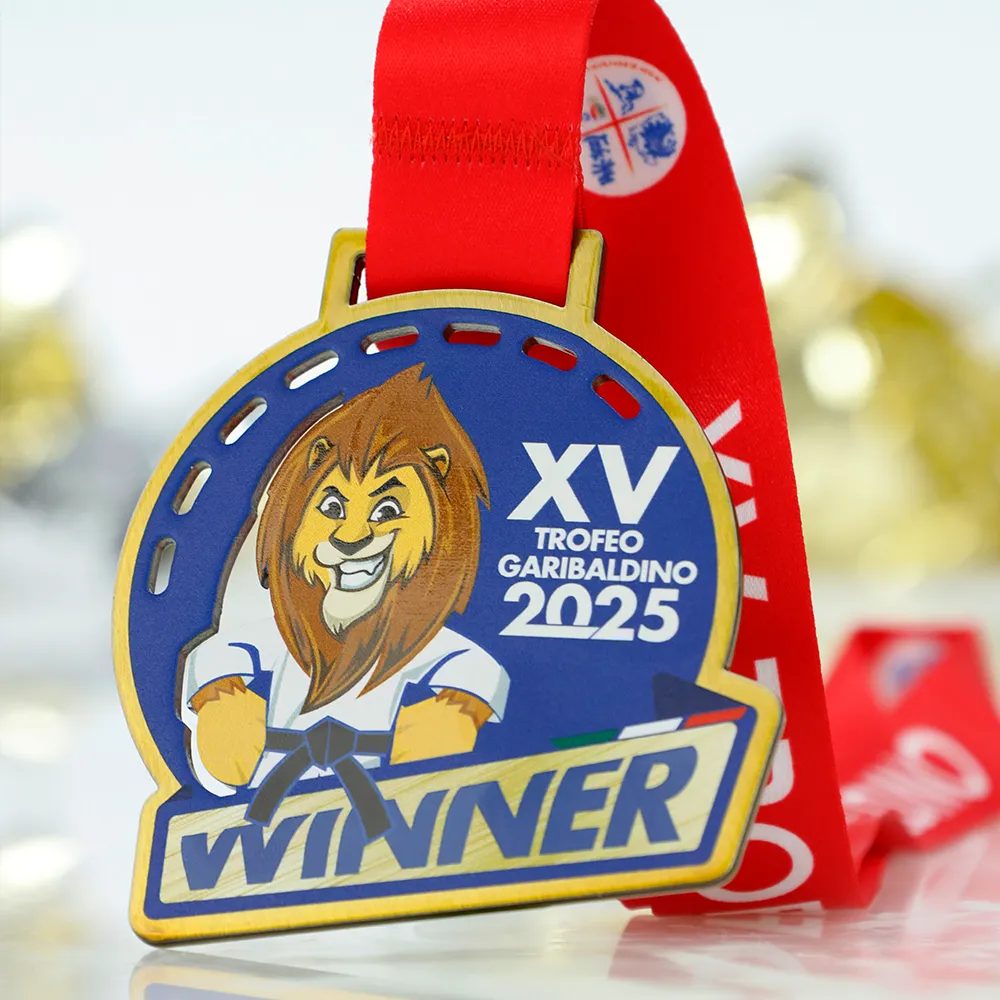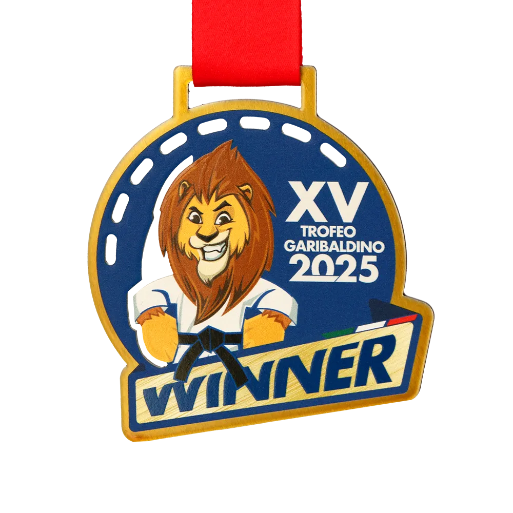 Esta medalla personalizada se diseñó para el torneo XV Trofeo Garibaldino 2025. Con contorno cortado por láser y redondeado a medida, luce superficie dorada y un intenso azul en impresión UV en el anverso. El motivo central, impreso en UV, muestra un león con judogi; debajo aparecen la palabra “WINNER” y la bandera de Italia.