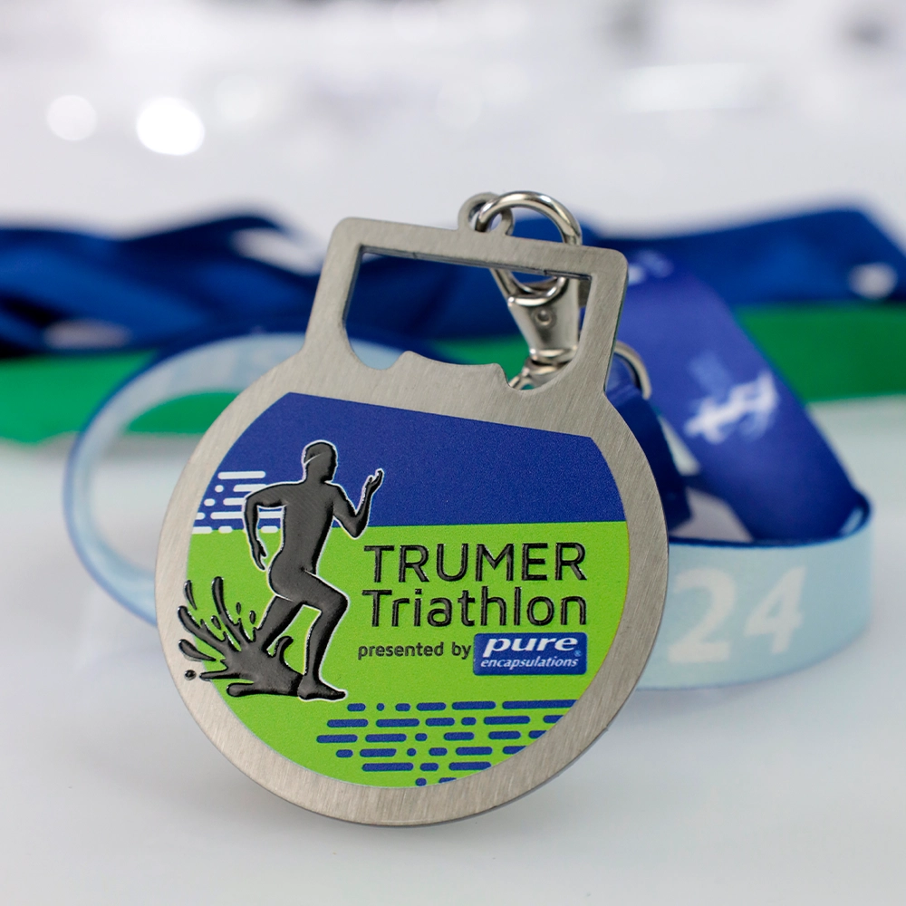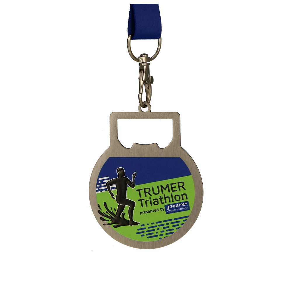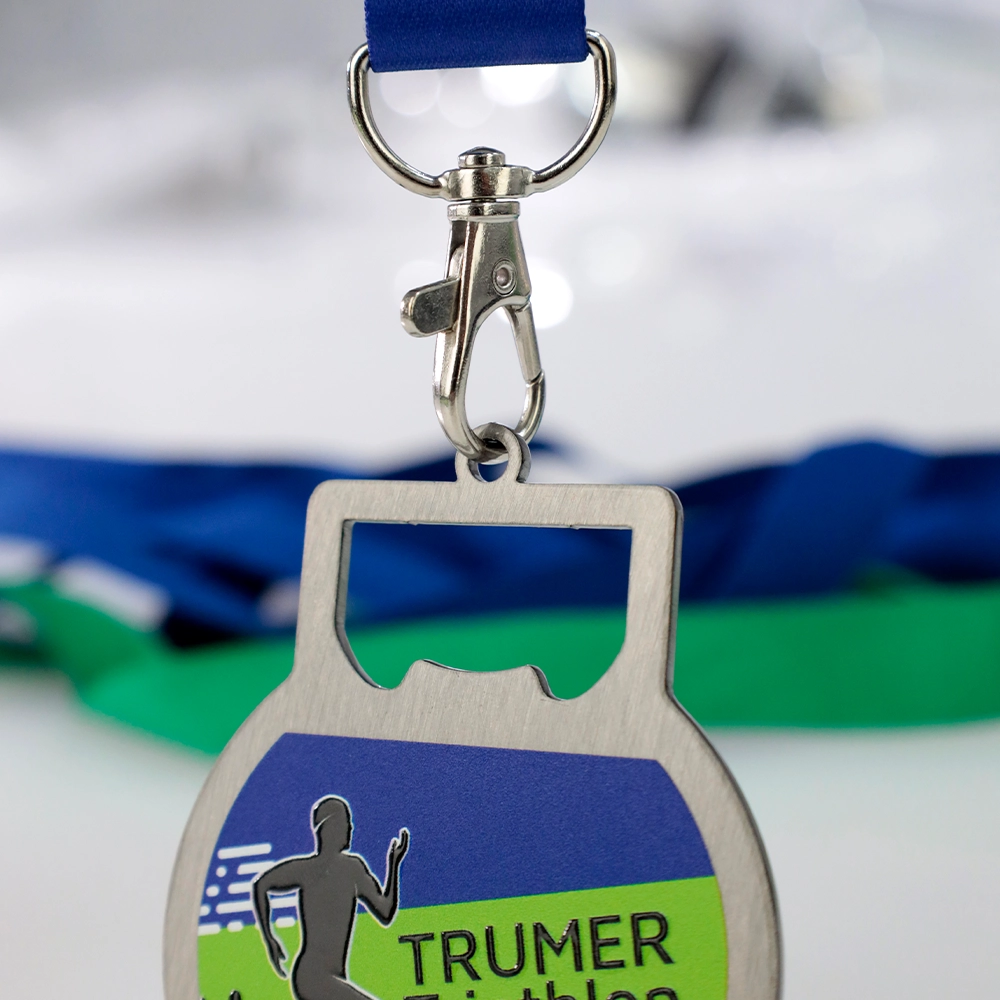 La medalla personalizada de triatlón para los participantes del Trumer Triathlon es un recuerdo de este evento. Presenta la figura de un atleta corriendo y está cortada con láser en metal, lo que permite cualquier forma. Las decoraciones en color se realizaron con impresión UV, dándole un aspecto distintivo.