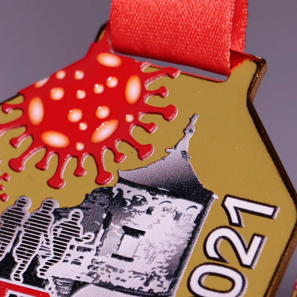 Medalla de acero dorada con impresión a color inspirada en el running y la pandemia de coronavirus.