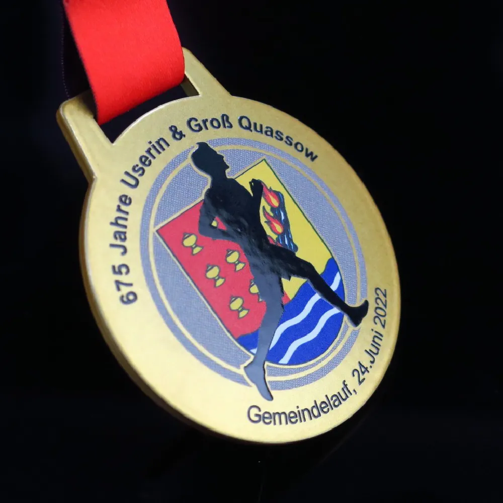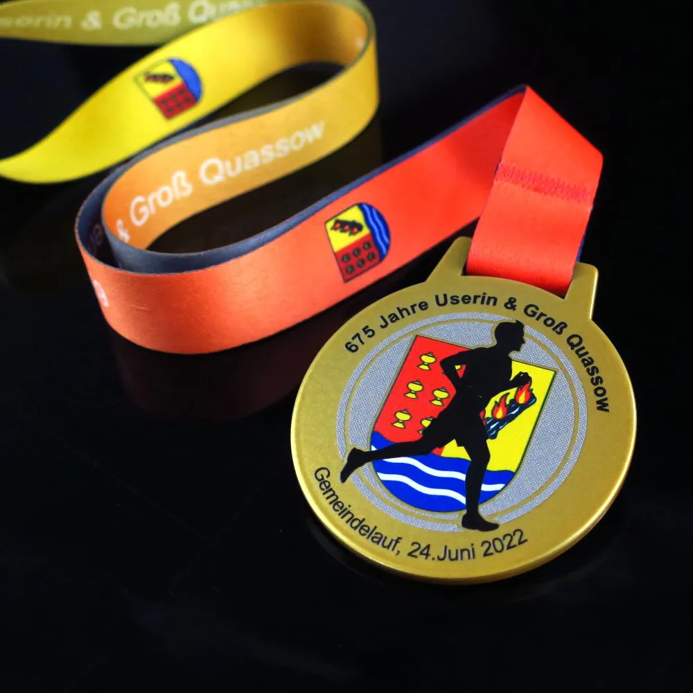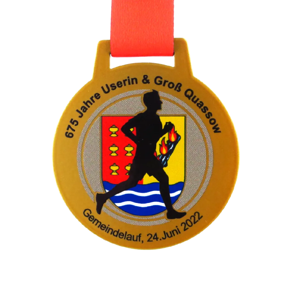 El oro es un color que, sin lugar a dudas, se asocia con la victoria. Por eso, todos los que finalizaron la carrera Userin & Gross Quassow Gemeindelauf fueron premiados por el organizador con unas exclusivas medallas para carrera en color oro. Las medallas de acero fueron elaboradas por encargo individual en nuestra empresa. Además del color dorado y la clásica forma redonda, las medallas cuentan con una impresión multicolor con un motivo de carrera. Todo el conjunto se remata con una cinta de sublimación en colores a juego.