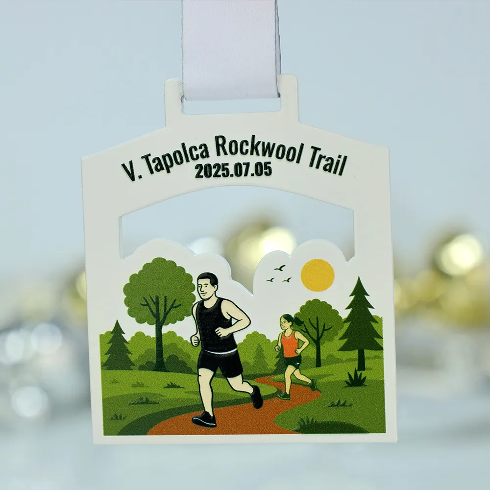 Hemos creado esta llamativa medalla personalizada para el V. Tapolca Rockwool Trail, combinando acero resistente con un acabado estético. El diseño destaca por su forma interesante y una ilustración detallada y colorida de la ruta y los corredores, realizada mediante impresión UV. Los vibrantes colores verde y amarillo sobre el fondo blanco reflejan perfectamente el ambiente alegre de esta carrera de montaña de verano. Es un excelente ejemplo de un premio que está 100% adaptado al carácter del evento deportivo.