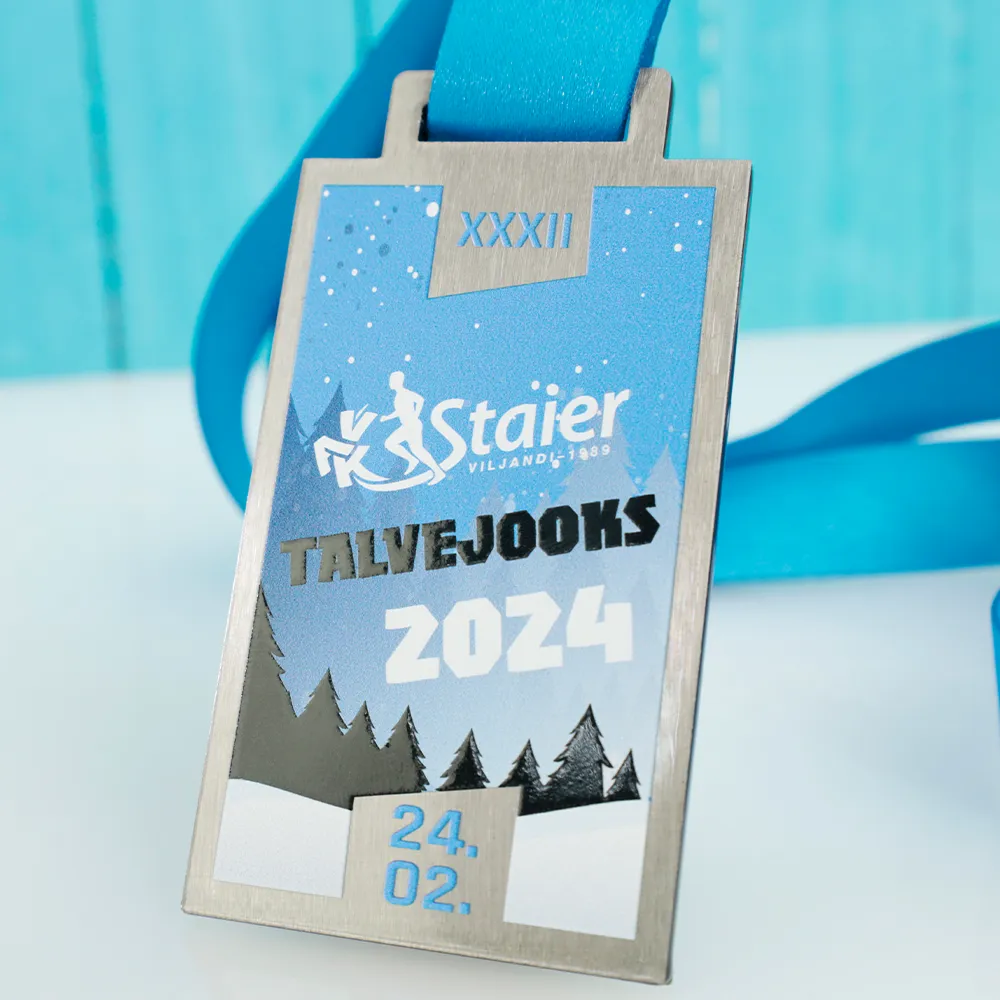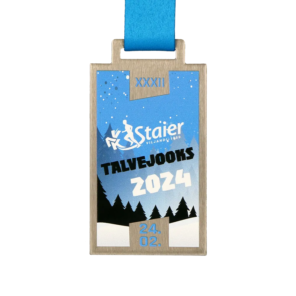 Una medalla personalizada de carrera creada para el evento Vak Staieri Talvejooks 2024 es un honor para los participantes de esta carrera invernal. La medalla presenta un motivo de invierno con un bosque y estrellas, capturando perfectamente la atmósfera de una carrera invernal. Los gráficos en color, incluido el logotipo del evento, se aplicaron mediante impresión UV.