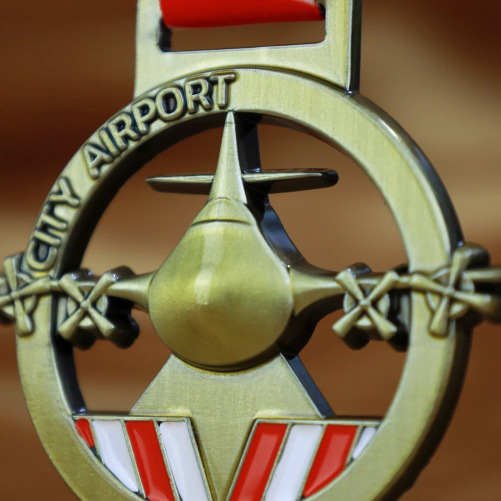 Medalla de fundición dorada de forma redonda. Su singularidad se realza con esmalte de colores y decoraciones tridimensionales en forma de inscripciones y un motivo de avión.