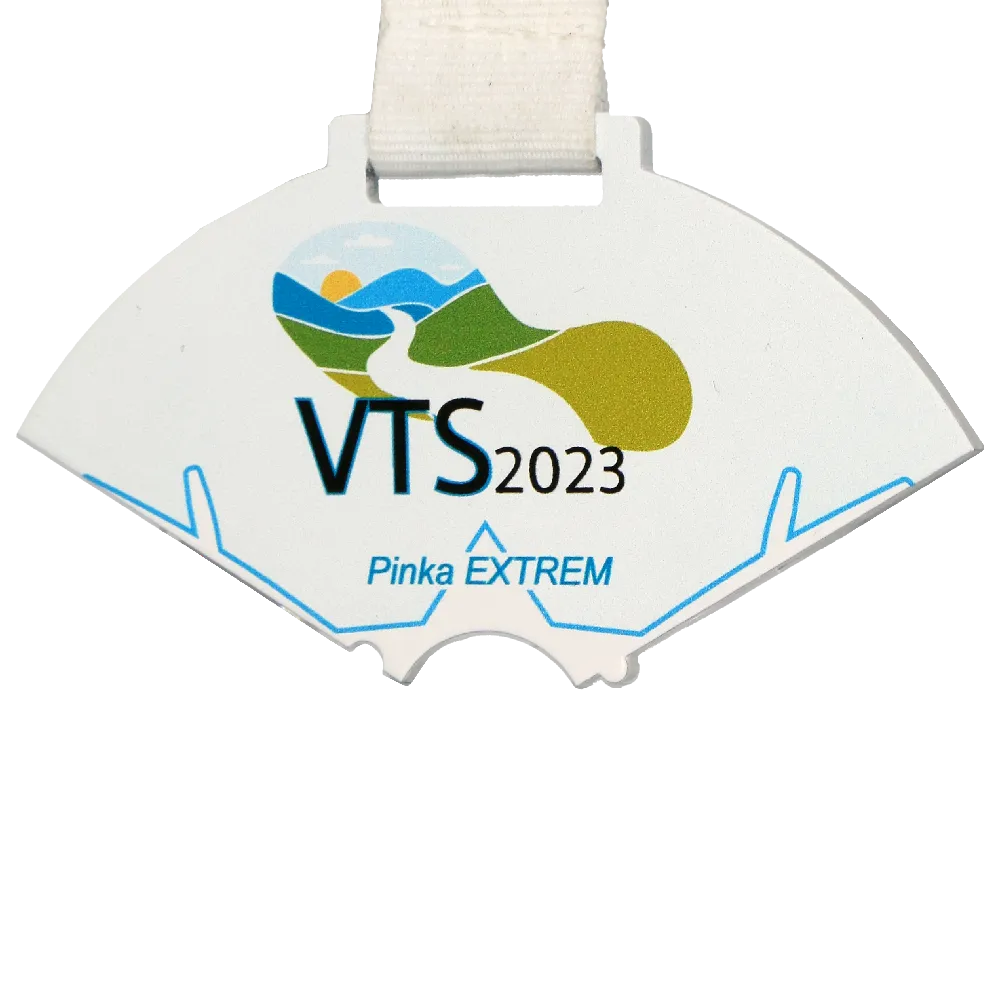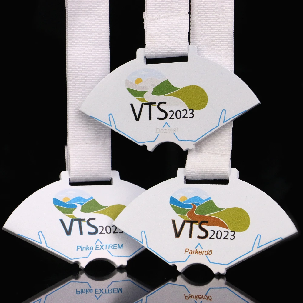 Cada día diseñamos y fabricamos medallas únicas según pedidos individuales. En esta ocasión, nuestros especialistas diseñaron y produjeron distintivas medallas de acero con formas cortadas a láser. Como resultado, cada elemento del conjunto encaja perfectamente. Las medallas también tienen un color blanco, que sirve como fondo ideal para la impresión multicolor. Esta personalización garantiza que cada medalla sea única y presente gráficos diferentes. El conjunto se completa con una cinta perfectamente combinada, haciendo que las medallas personalizadas luzcan espectaculares cuando las llevan los ganadores.