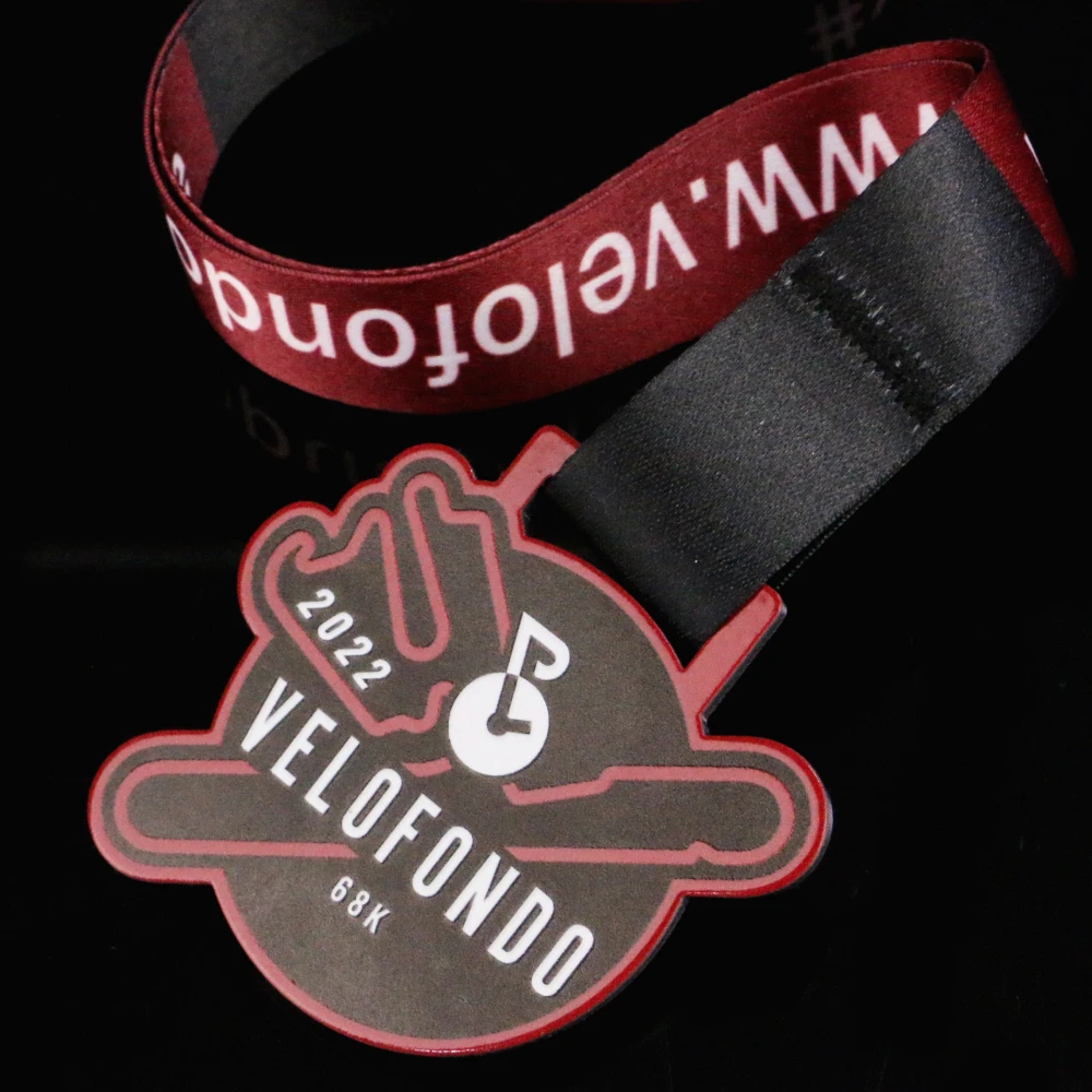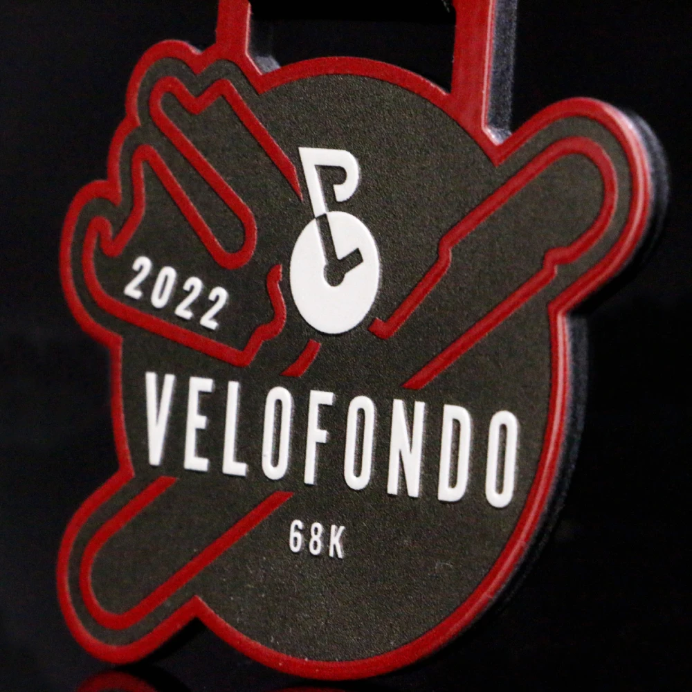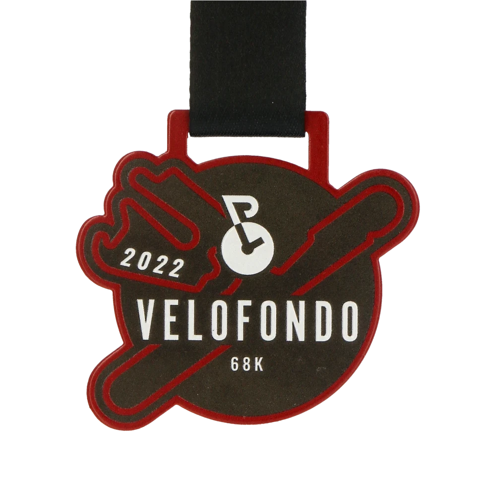 Cada competición ciclista es diferente. Por eso, en Winmed, diseñamos medallas personalizadas que reflejan plenamente la atmósfera de un evento. Uno de nuestros diseños más recientes para ciclismo es la medalla que fabricamos para Velofondo 68K. Cortamos estas modernas medallas de láminas de acero utilizando tecnología láser. Su color negro profundo se suaviza con elementos rojos a juego, lo que las hace realmente únicas. Además de la combinación de colores, también llaman la atención la superficie brillante y la forma exclusiva. El diseño se completa con una cinta personalizada perfectamente adaptada.