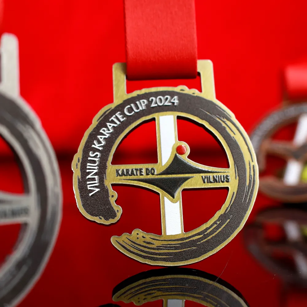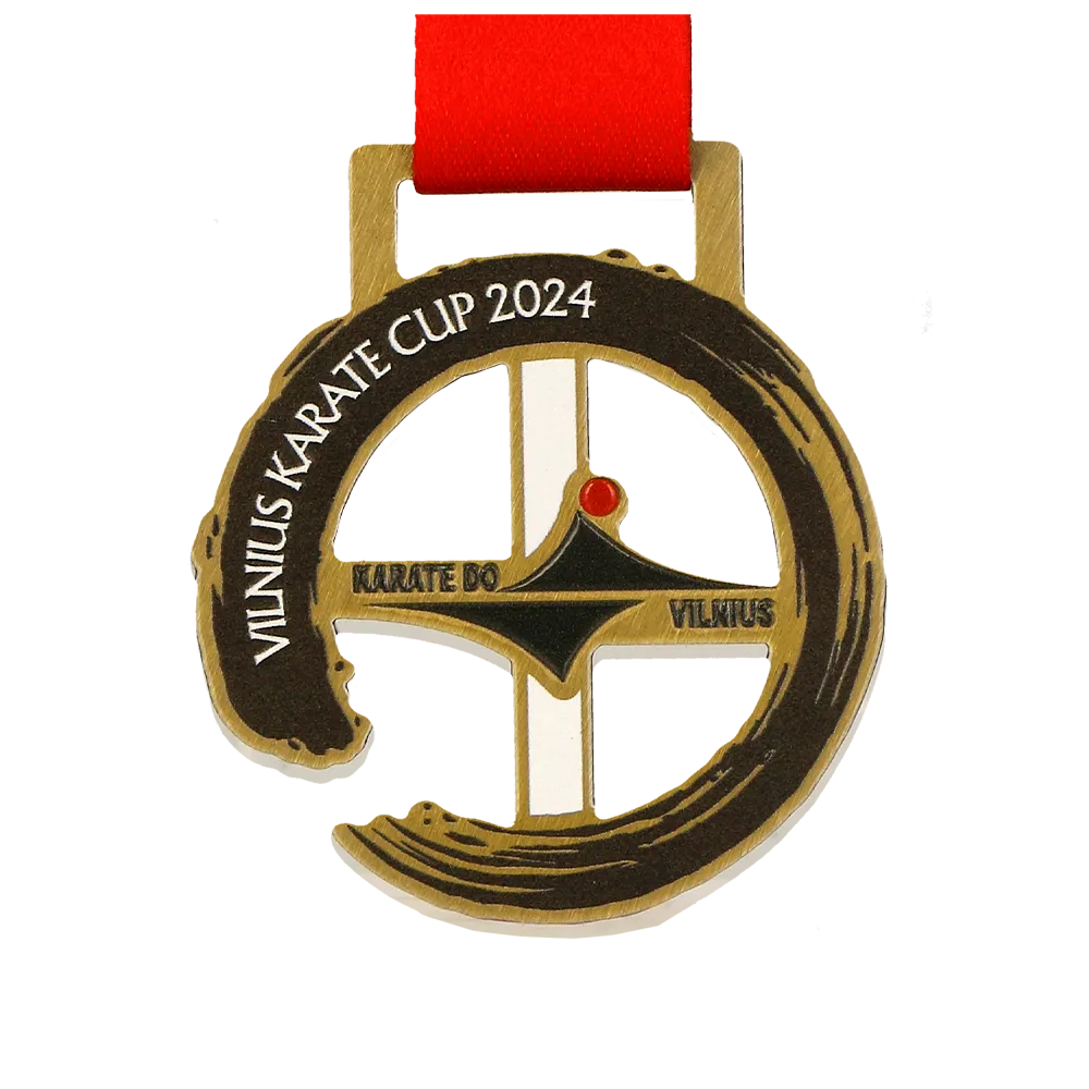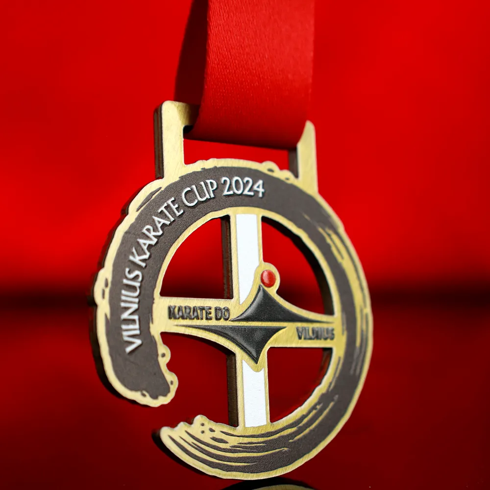 La medalla personalizada de kárate para el Vilnius Karate Cup 2024 es perfecta como recompensa para los participantes del torneo. La medalla es de color dorado con acentos negros y rojos. Tiene forma redonda con recortes asimétricos, lo que le da un aspecto moderno y único.