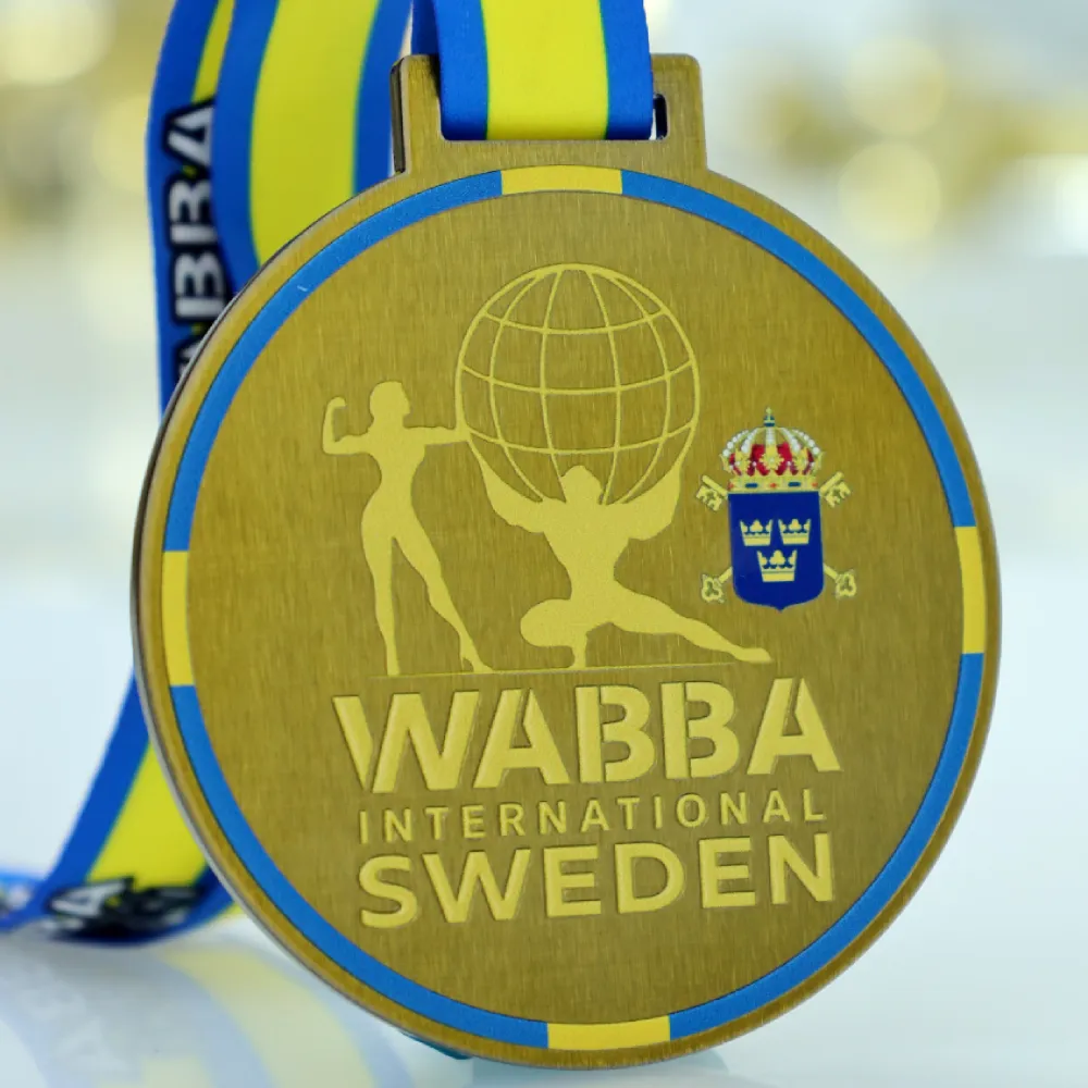Una medalla personalizada dorada diseñada para la competición WABBA International Sweden. Fabricada en acero, con un acabado dorado clásico y decorada con impresión UV. El diseño muestra figuras de culturistas y un globo terráqueo destacado, acompañado del escudo de armas de Suecia. La medalla viene con una cinta dedicada en colores nacionales.