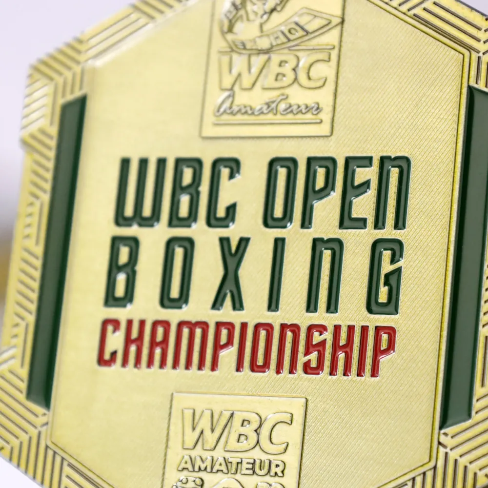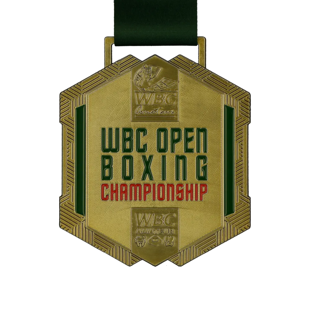 Unas medallas personalizadas creadas para el WBC Open Boxing Championship. Fabricadas en metal de color dorado, con detalles en esmalte verde y rojo. En el anverso aparece el logotipo de WBC Amateur y las inscripciones bien definidas. En el reverso se muestra un boxeador en relieve con casco y guantes sobre un fondo de ring de boxeo, rellenado con esmalte.