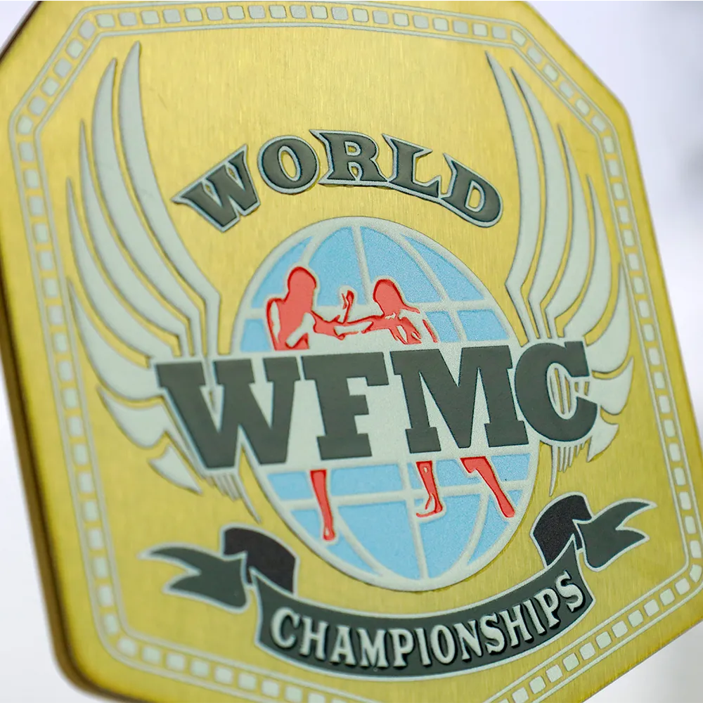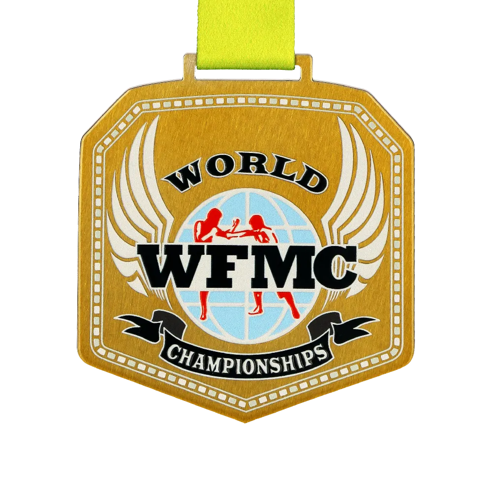 Una medalla personalizada para deportes de combate en el Campeonato Mundial WFMC 2023. La medalla tiene forma hexagonal y color dorado. En la parte central se encuentra el logotipo de la WFMC rodeado de alas, aplicado con impresión UV.