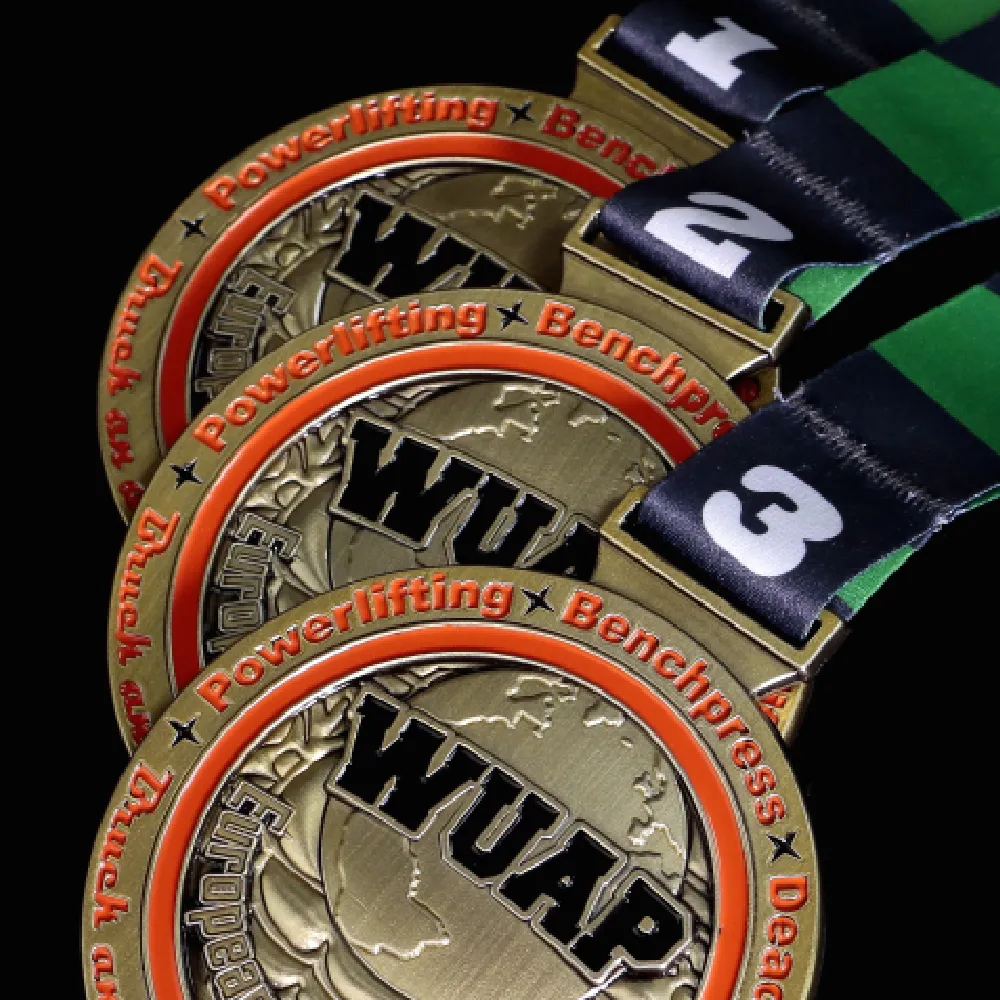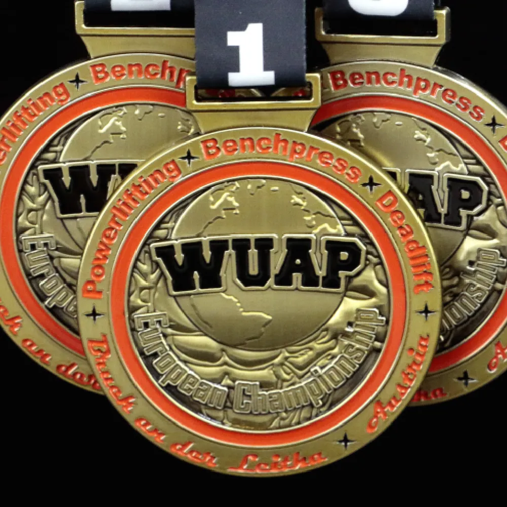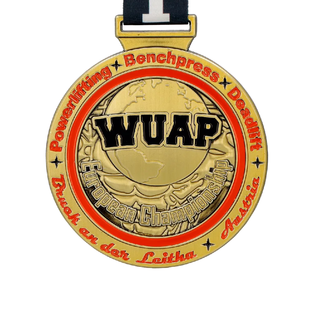 Los deportes de fuerza son una disciplina que exige muchos sacrificios al atleta. No obstante, es un deporte que proporciona una gran satisfacción. Practicarlo regularmente no solo construye una figura fuerte, sino también un carácter sólido. Ganar, por lo tanto, no es solo simbólico en este ámbito, sino también una motivación para alcanzar éxitos aún mayores. El organizador de los Campeonatos Europeos WUAP, con la ayuda de Winmed, creó originales medallas de halterofilia para los mejores atletas. Estas medallas personalizadas tienen forma redonda y un color dorado que se asocia con la victoria. Además, en su superficie hay numerosas decoraciones tridimensionales complementadas con esmalte rojo y negro. Todo está rematado con una cinta de sublimación con las inscripciones impresas para el primer, segundo y tercer puesto.