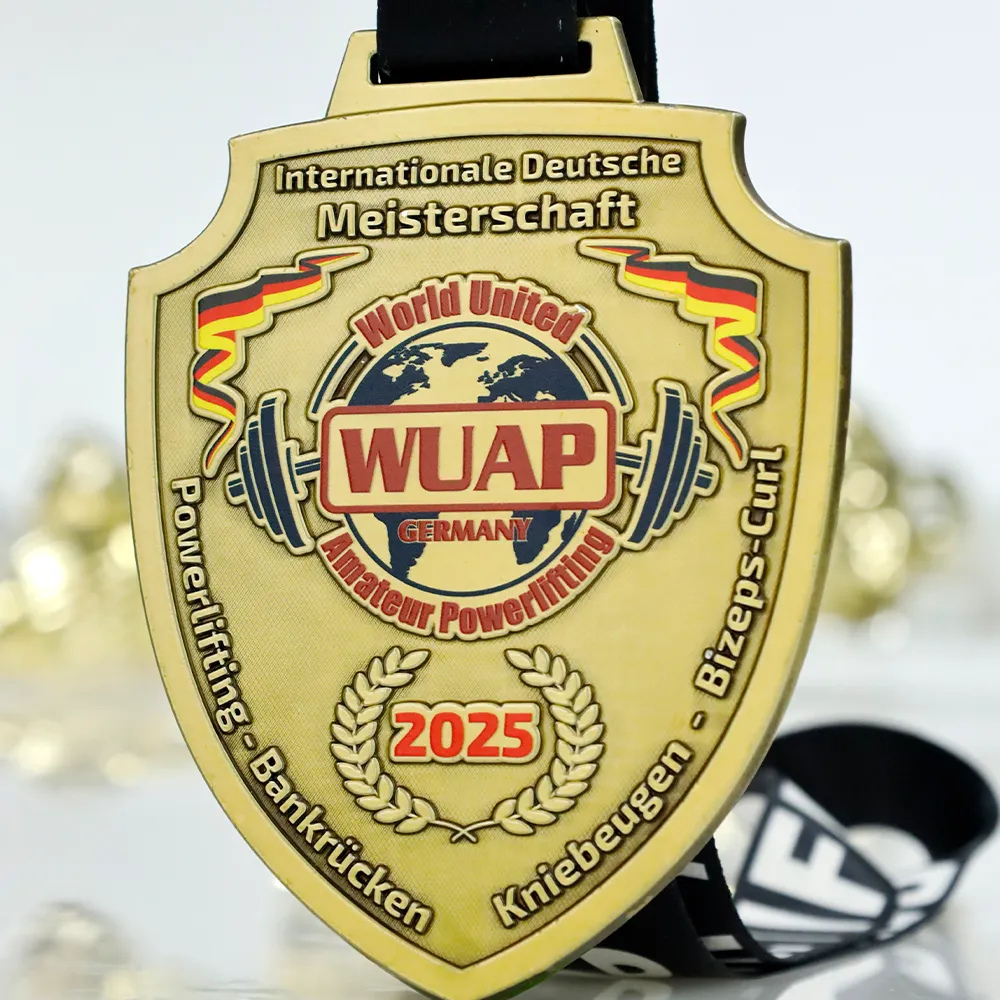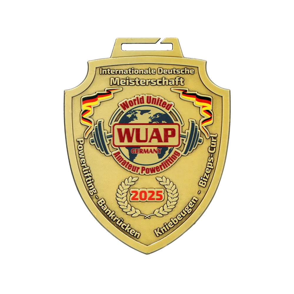 Medalla fundida preparada para el Internationale Deutsche Meisterschaft WUAP Germany 2025. La forma fue fundida en un molde con aspecto de escudo. Las decoraciones y gráficos se realizaron con esmalte de colores rojo, amarillo y azul marino. La medalla está destinada a los participantes de competiciones de powerlifting.