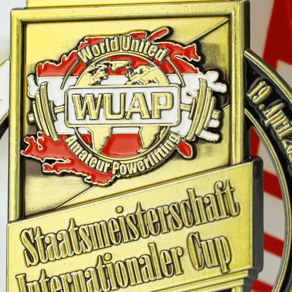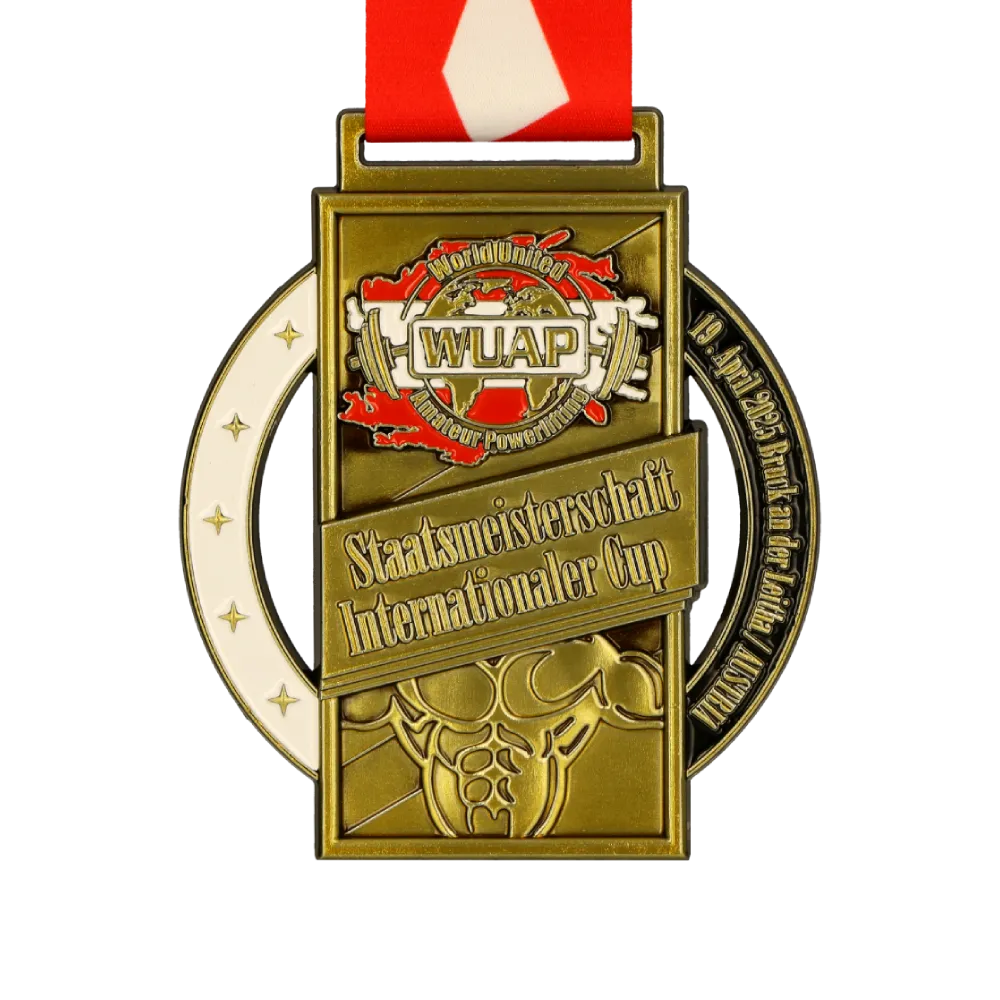 Medallas personalizadas doradas creadas para el WUAP Staatsmeisterschaft Internationaler Cup. Una medalla personalizada fundida diseñada para un evento de powerlifting, con el logotipo de WUAP esmaltado en rojo y blanco, simbolizando el alcance internacional de la organización. La medalla personalizada muestra el nombre del evento y un gráfico de un torso musculoso, destacando la fuerza y el espíritu deportivo.