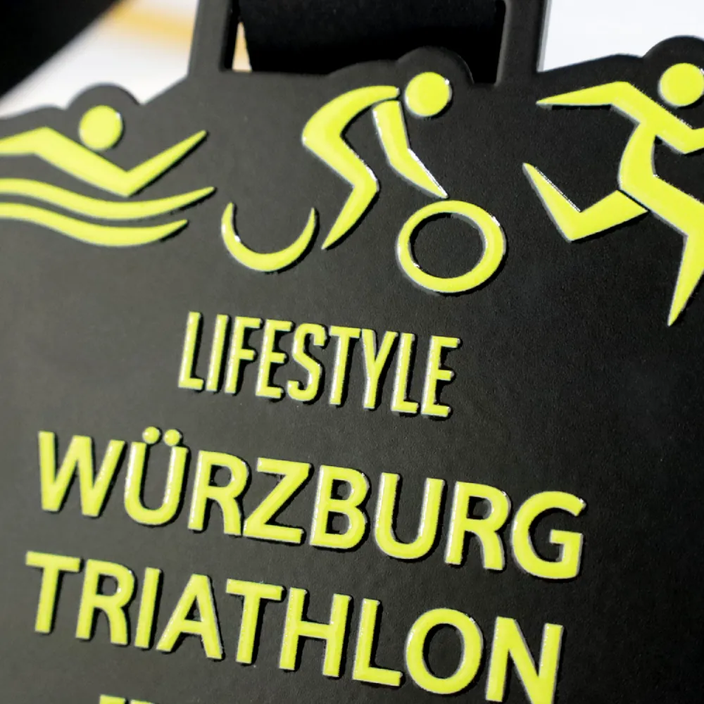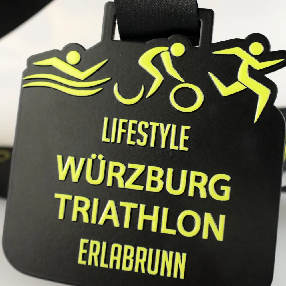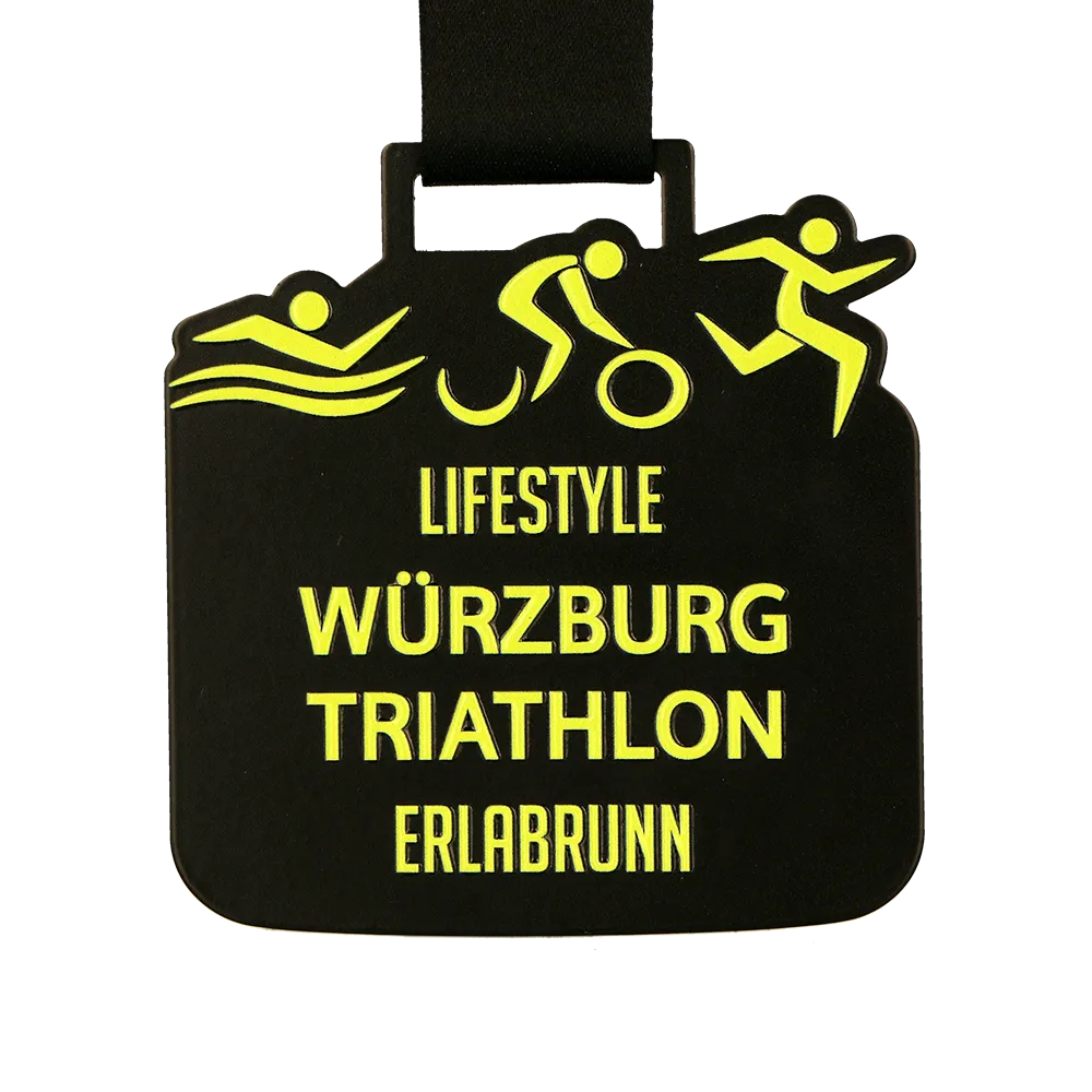 Una medalla personalizada de triatlón para los participantes del Lifestyle Würzburg Triathlon Erlabrunn. La medalla presenta tres iconos que simbolizan la natación, el ciclismo y la carrera, reflejando las disciplinas del triatlón. Una elección ideal para organizadores de triatlón.