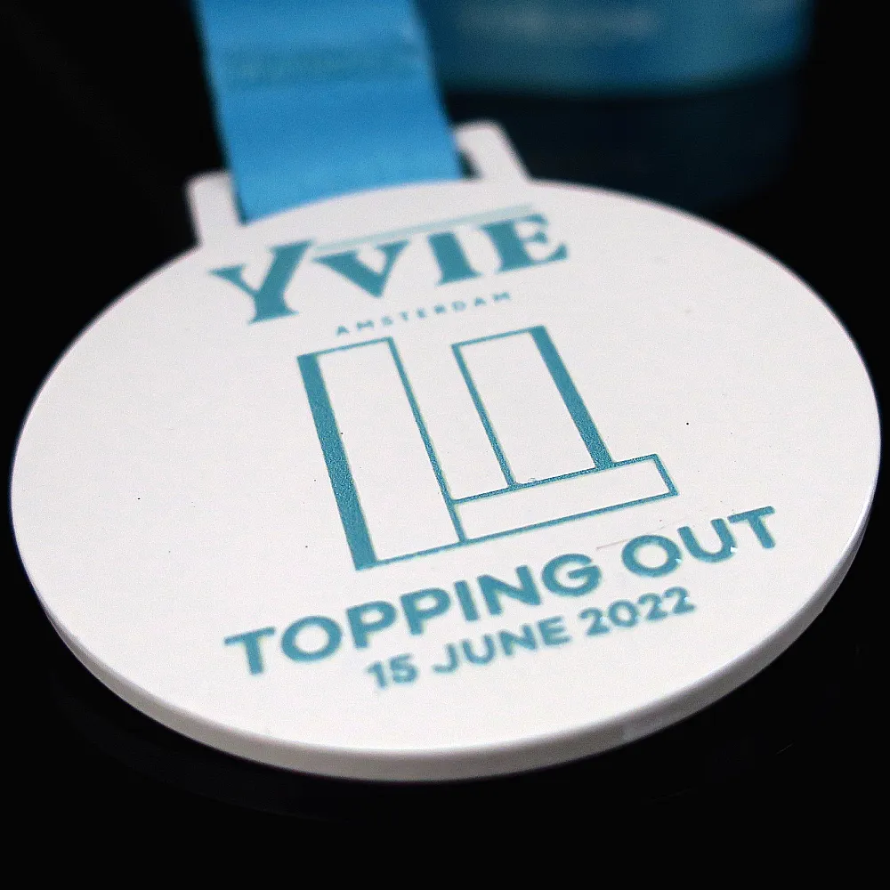 Las medallas en su forma clásica suelen tener una forma redonda. Actualmente, esta forma a menudo se enriquece con decoraciones modernas que hacen que estas medallas se diferencien de todas las demás. Un ejemplo de esta implementación única son las medallas de acero que Winmed preparó para el YVIE Amsterdam Topping Out en 2022. Estas medallas personalizadas son de color blanco, lo que constituye el fondo perfecto para la impresión. En su superficie hay muchas decoraciones impresas en un tono azul intenso. Además, la medalla está coronada con una cinta de sublimación que combina con el diseño del premio.