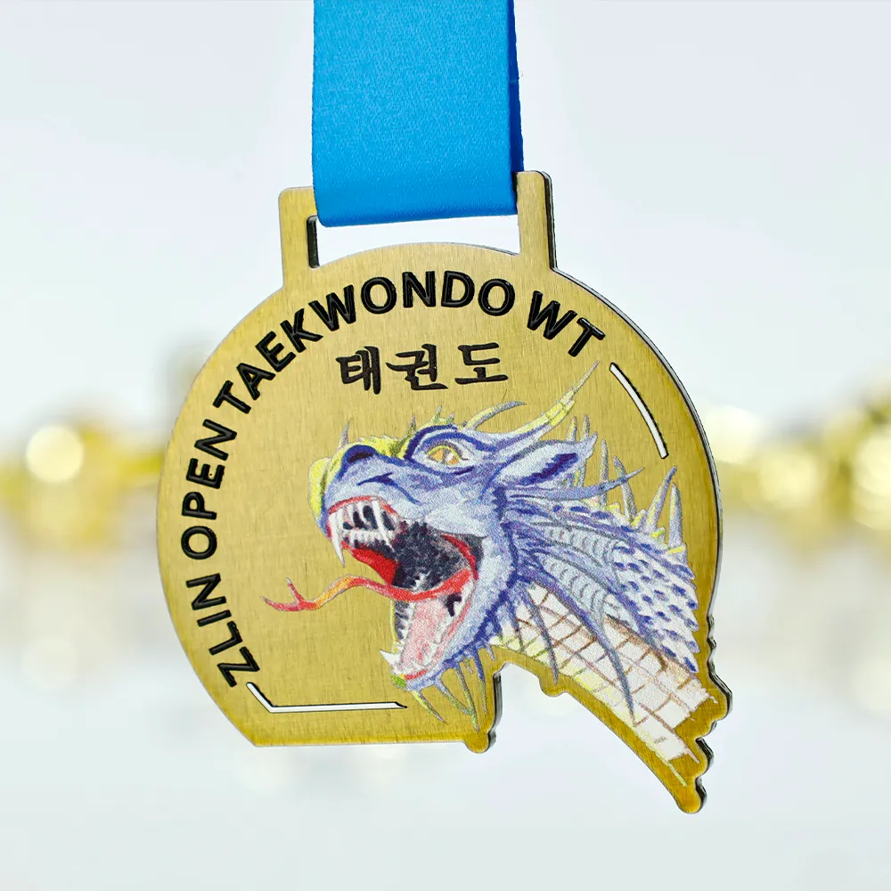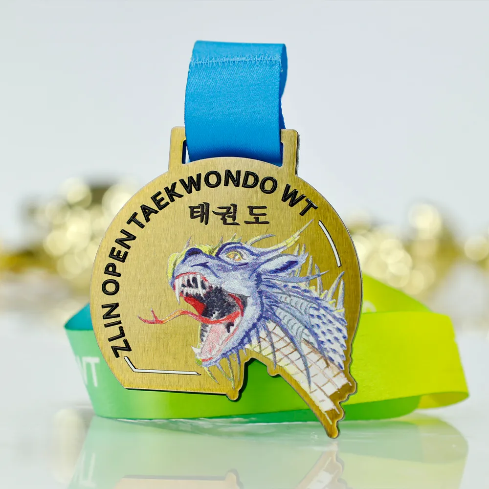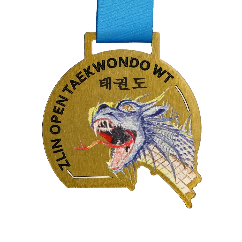 Medalla personalizada creada para el torneo Zlin Open Taekwondo. Fabricada en metal, con una llamativa imagen de dragón impresa a color mediante tecnología UV.