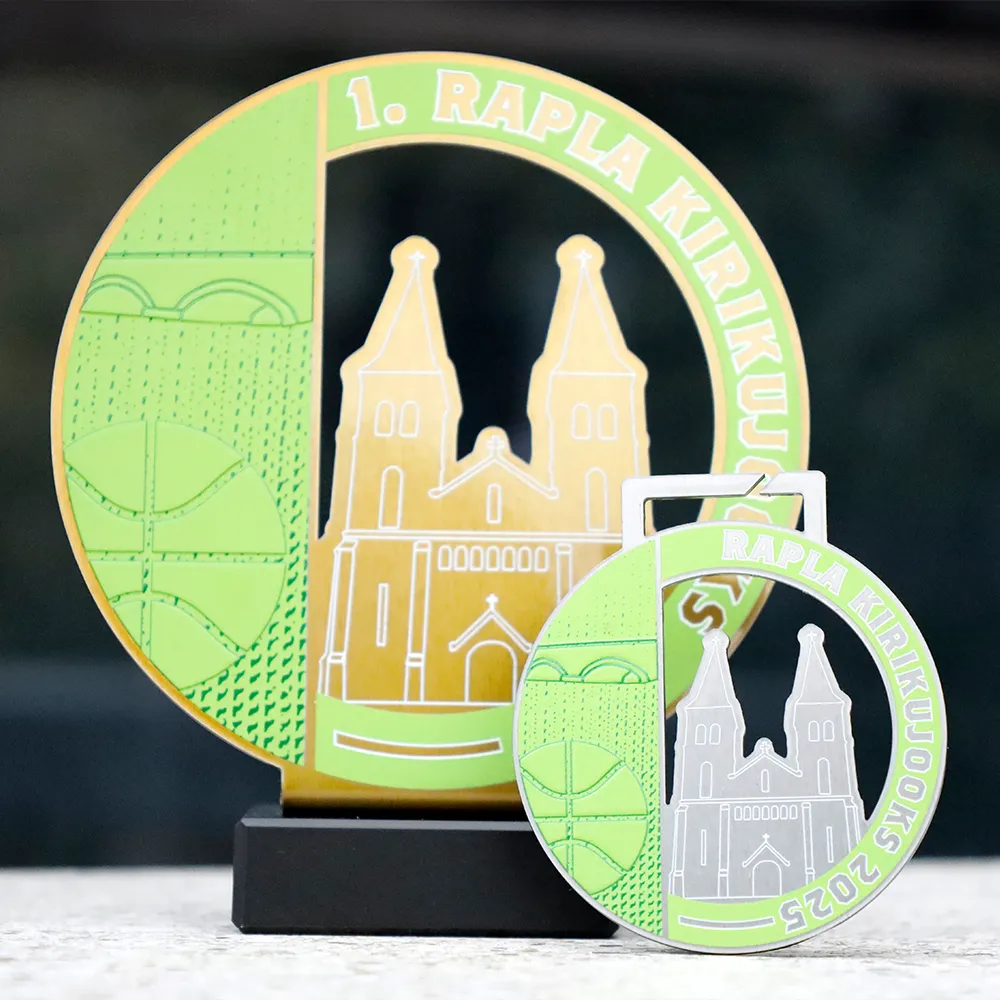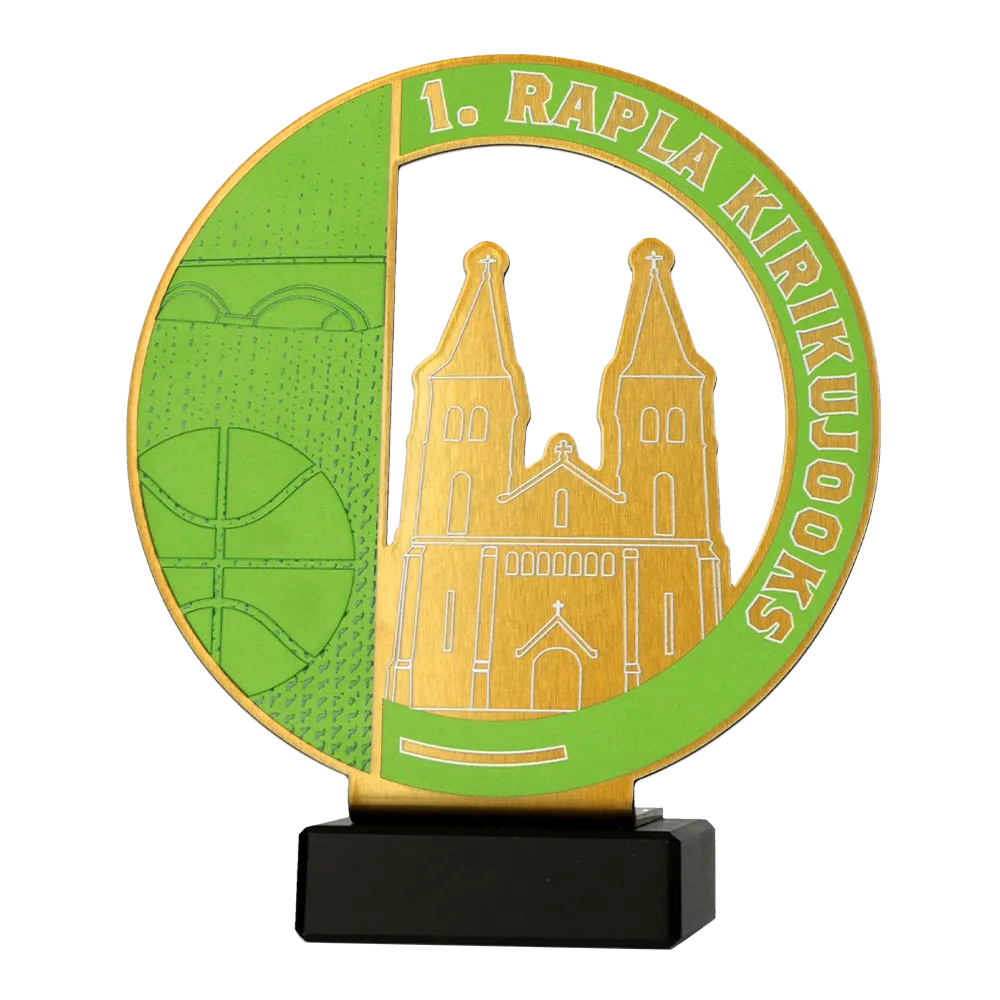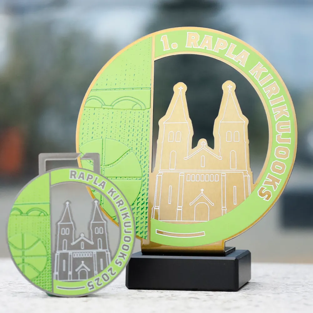 Trofeo de metal montado sobre una base de mármol. La forma fue recortada con precisión con láser y los elementos a color decorados con impresión UV. El diseño presenta un motivo arquitectónico característico y un gráfico deportivo que refuerza el carácter local del evento. Este trofeo personalizado fue preparado para una carrera.