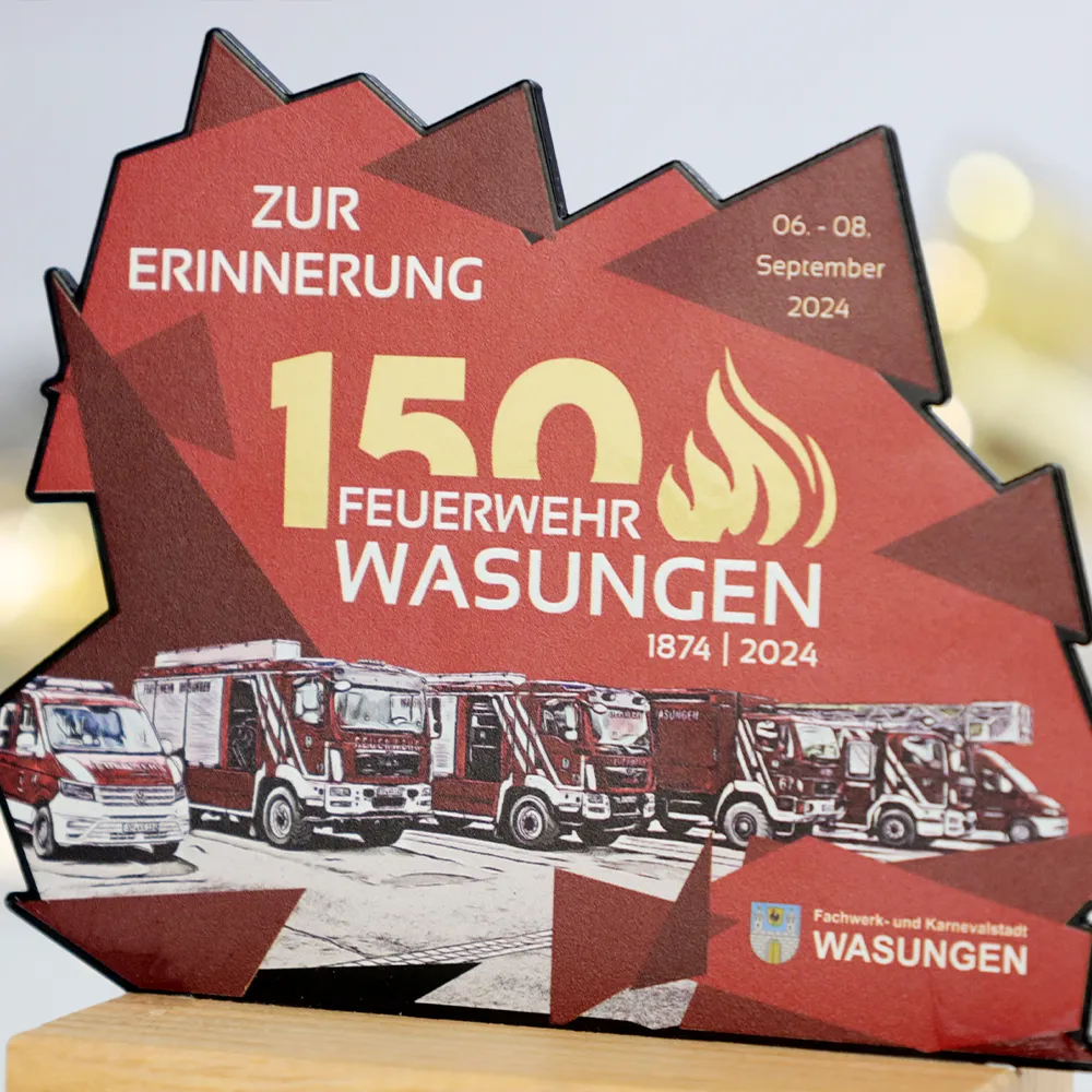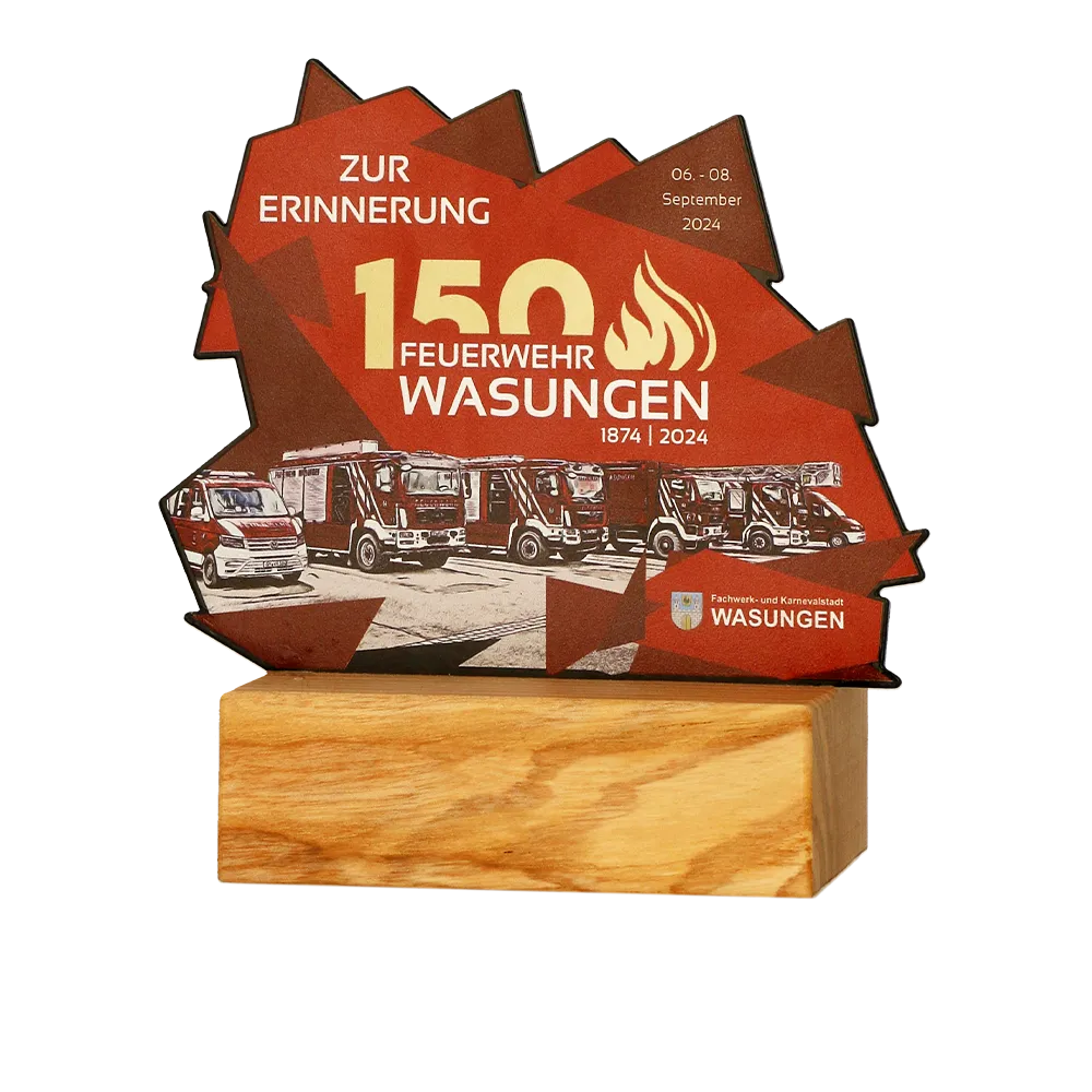 Este trofeo personalizado, un reconocimiento adaptado individualmente, fue creado con motivo del 150º aniversario del cuerpo de bomberos de Wasungen. El diseño muestra un gráfico estilizado con vehículos de bomberos sobre un rojo intenso que simboliza el valor y la dedicación de los bomberos. Fabricado en metal con impresión UV, el trofeo está montado sobre una base sólida de madera, que le aporta durabilidad y elegancia.