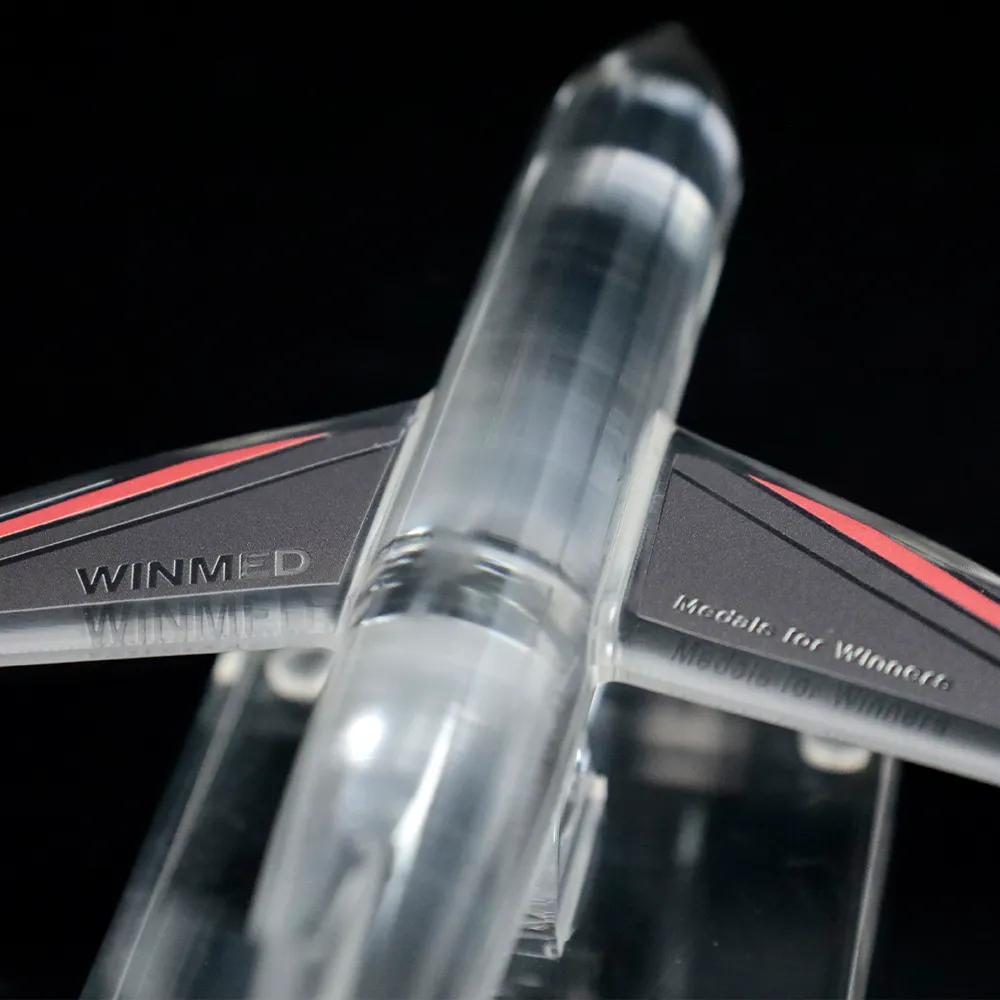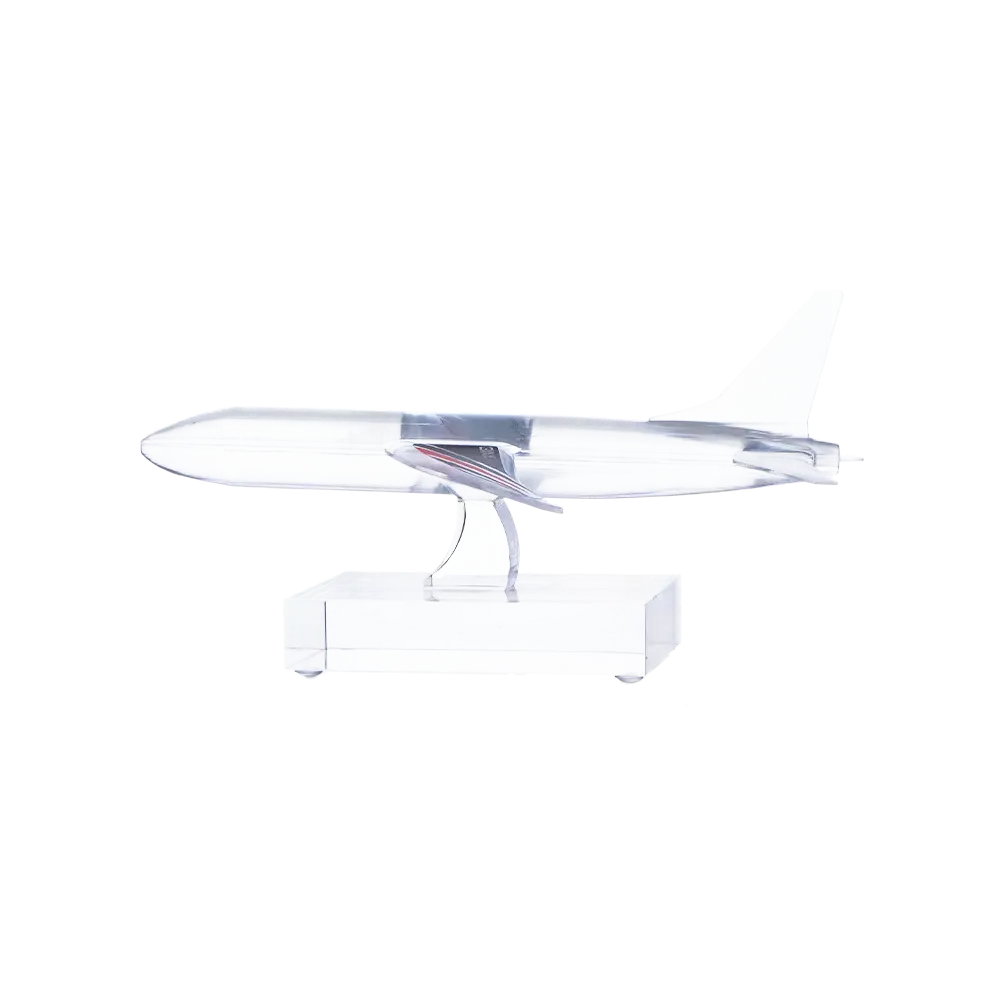 Trofeo de acrílico con forma de avión, haciendo referencia a temas de aviación. La forma fue cortada con láser con precisión, haciéndolo excepcionalmente detallado. Tanto la parte superior como la base están hechas de acrílico, haciendo que el trofeo sea ligero y moderno.
