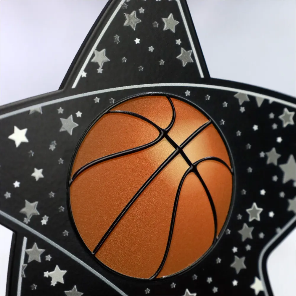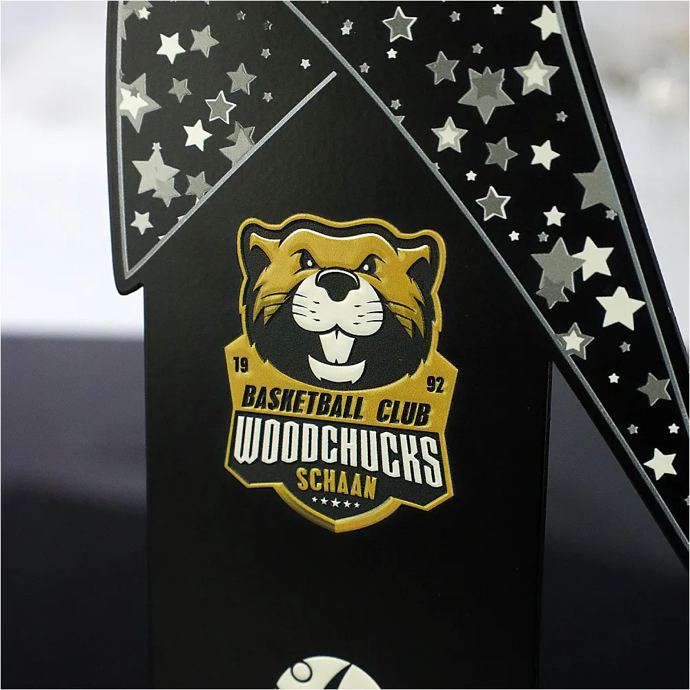 Trofeo personalizado hecho para Basketball Club Woodchucks Schaan. El premio presenta una gran estrella decorada con numerosas estrellas más pequeñas, con un balón de baloncesto en su centro. Construido en metal y acrílico, está montado sobre una base rectangular negra. El trofeo incluye logos impresos para el club de baloncesto y Schulsport Liechtenstein.