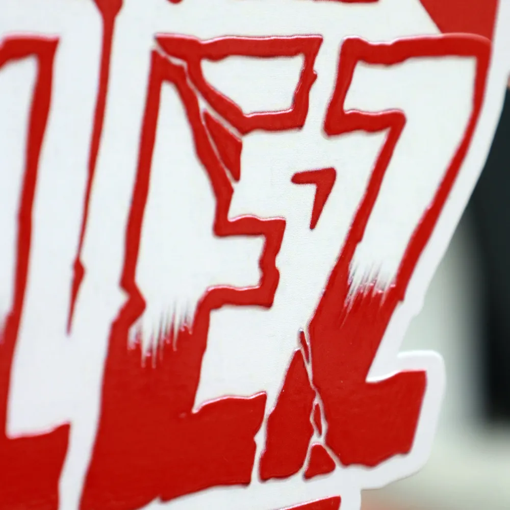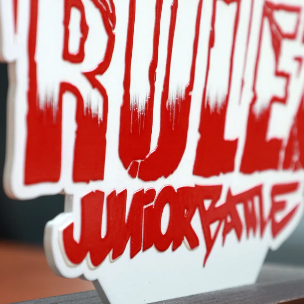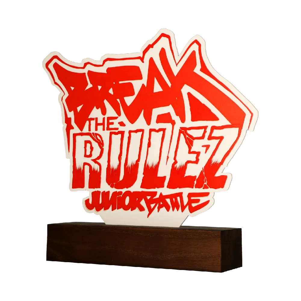 Trofeos personalizados para Break the Rulez Junior Battle. El trofeo presenta texto en estilo graffiti en rojo y blanco, cortado en acrílico y montado sobre una base de madera oscura.