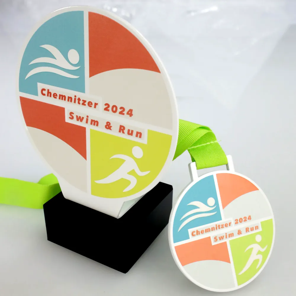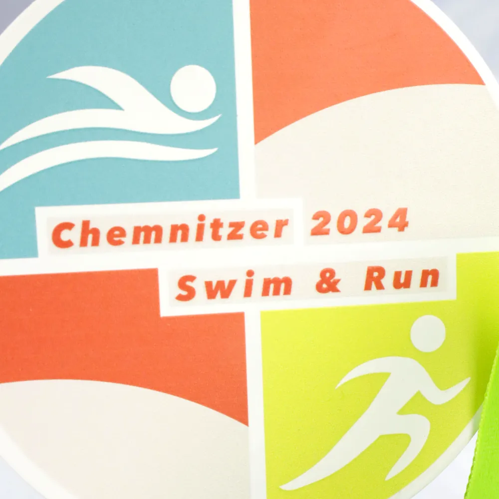 Trofeo personalizado especialmente preparado para la competición Chemnitzer 2024 Swim & Run. El trofeo es circular, con gráficos que simbolizan la natación y la carrera. Los colores vivos y las inscripciones hechas con impresión UV garantizan durabilidad. El trofeo está montado sobre una base sólida de mármol.