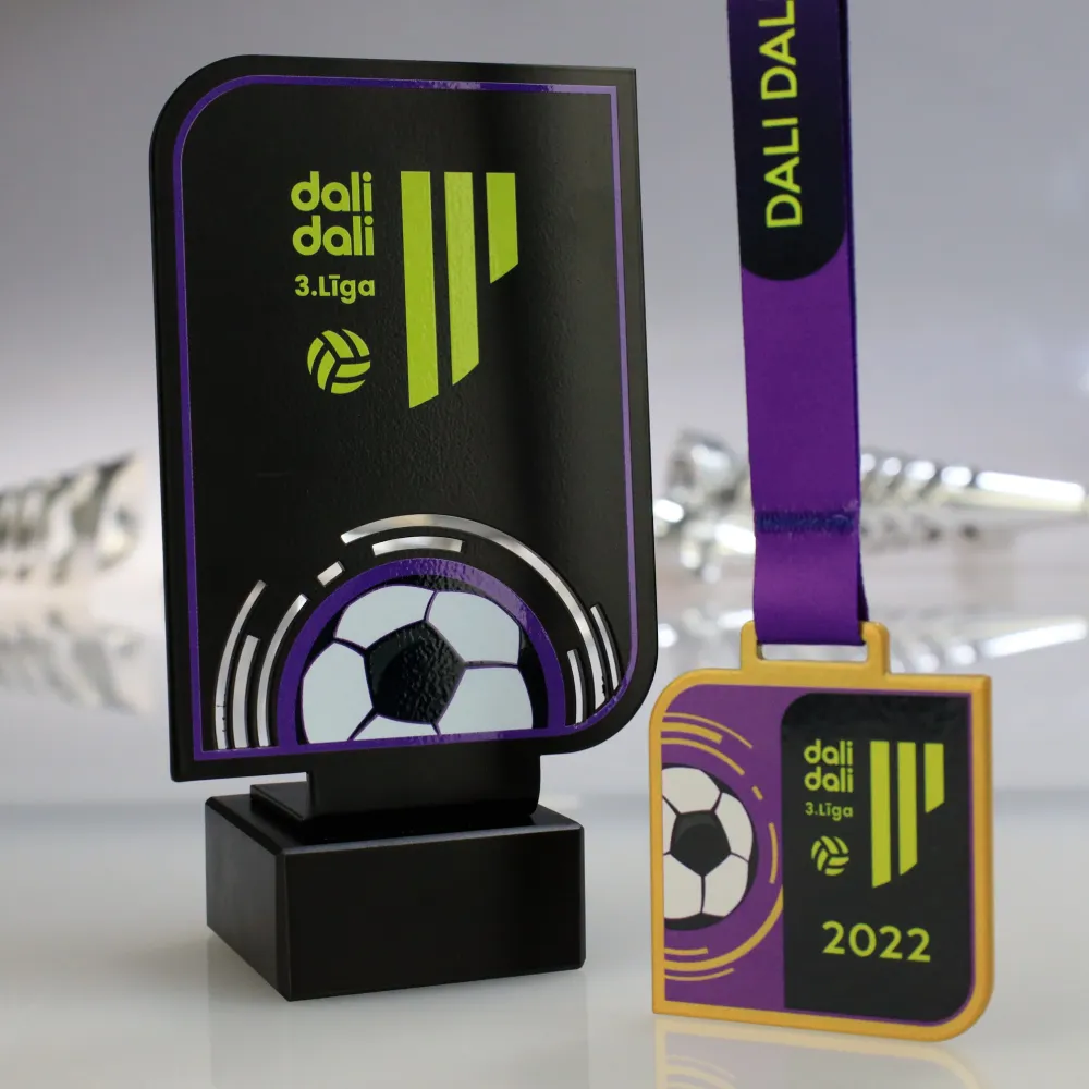 Durante un torneo de fútbol, todo el equipo lucha por la victoria. Sin embargo, el éxito también depende en gran medida de las habilidades individuales de los jugadores. Por eso, tanto los equipos completos como los mejores jugadores deben ser recompensados adecuadamente. El organizador del torneo Dali Dali Ligas pensó en esto y mandó preparar premios modernos de fútbol por WinMed. Entre ellos hubo tanto medallas conmemorativas como increíbles trofeos de metal. Estos trofeos personalizados tienen una forma geométrica rectangular con redondeados intrigantes. Además, su color negro de base es el fondo perfecto para una impresión vívida y colorida. En la parte inferior del premio hay también recortes interesantes que diversifican el conjunto y enfatizan la decoración impresa de la pelota. Todo esto está coronado con una base de mármol, que añade peso al premio.