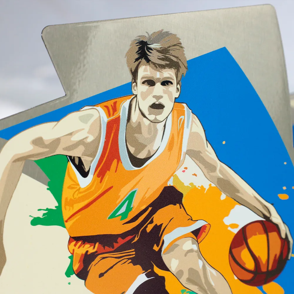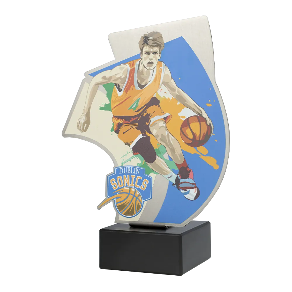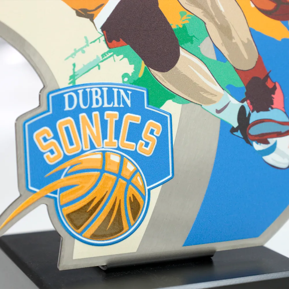El trofeo de baloncesto creado para el torneo Dublin Sonics tiene una apariencia dinámica, hecho de metal con detalles coloridos que representan la silueta de un jugador de baloncesto en acción. La base del premio está hecha de mármol.